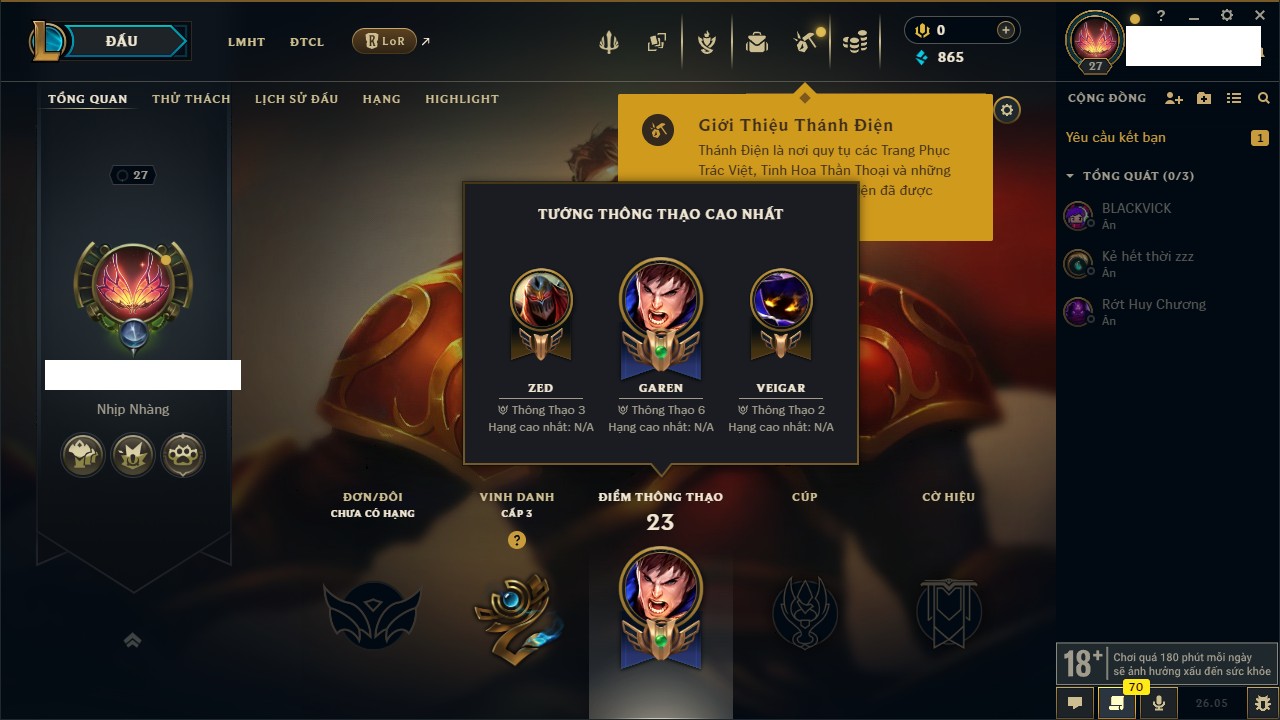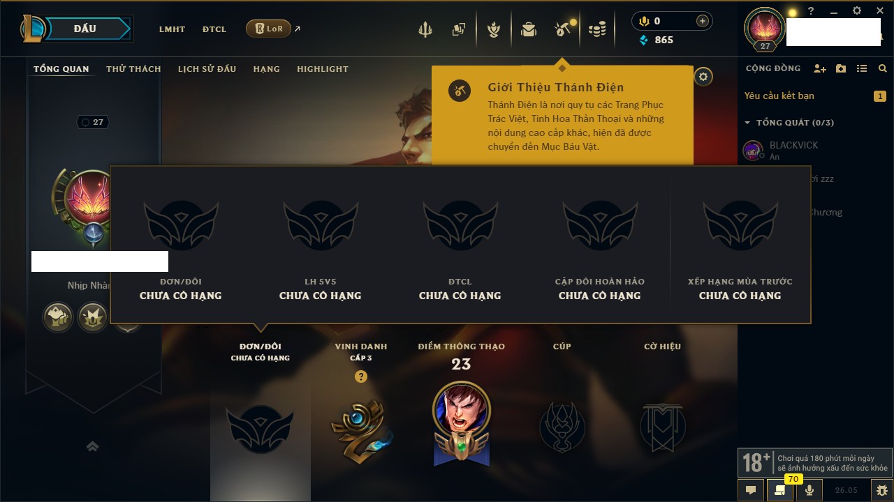 Rank Đơn: Chưa rank mùa nàoKhung: Chưa có khungTướng: 67 - Còn 6000 THXTrang Phục: 0Rank ĐTCL: Chưa RankLinh Thú: 5