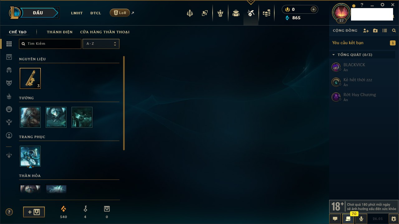 Rank Đơn: Chưa rank mùa nàoKhung: Chưa có khungTướng: 92 - Còn 16890 THXTrang Phục: 0Rank ĐTCL: Chưa RankLinh Thú: 8