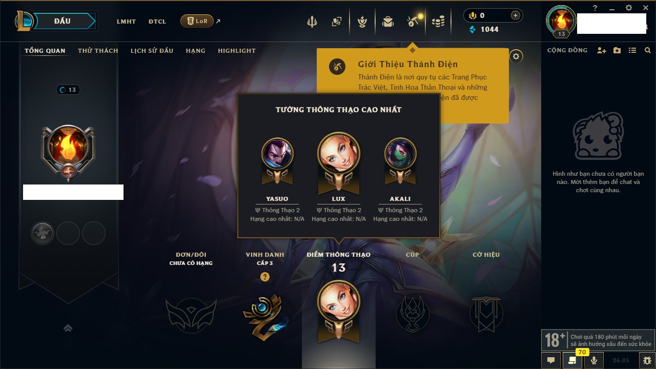 Rank Đơn: Chưa rank mùa nàoKhung: Chưa có khungTướng: 95 - Còn 3340 THXTrang Phục: 2Rank ĐTCL: Chưa RankLinh Thú: 32