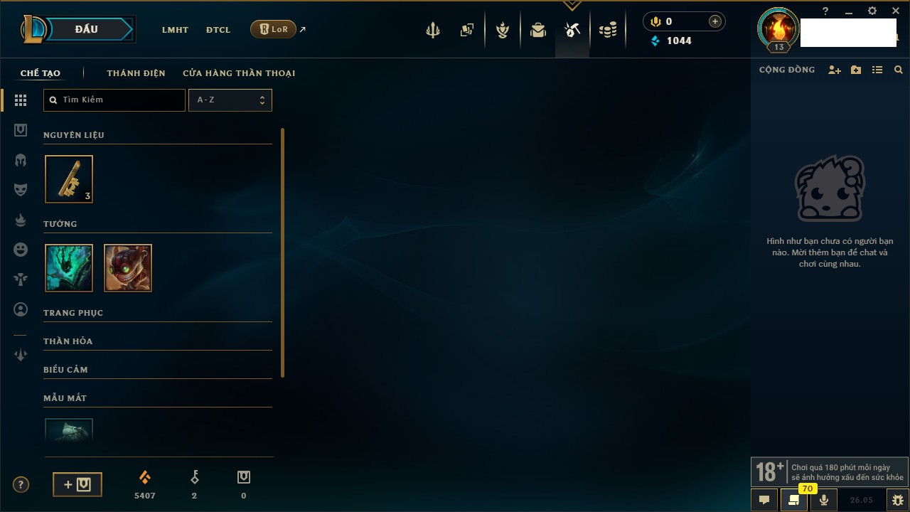 Rank Đơn: Chưa rank mùa nàoKhung: Chưa có khungTướng: 68 - Còn 3050 THXTrang Phục: 0Rank ĐTCL: Chưa RankLinh Thú: 9
