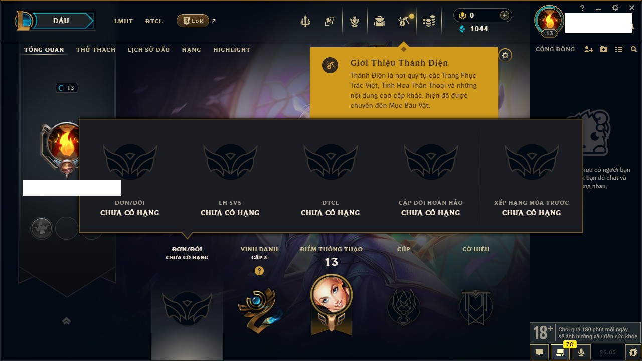 Rank Đơn: Chưa rank mùa nàoKhung: Chưa có khungTướng: 66 - Còn 2350 THXTrang Phục: 0Rank ĐTCL: Chưa RankLinh Thú: 13