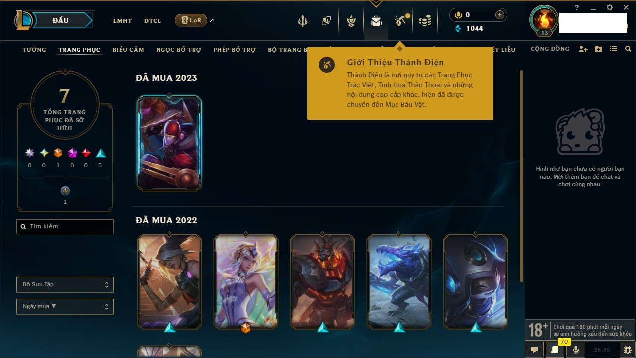 Rank Đơn: Chưa rank mùa nàoKhung: Chưa có khungTướng: 128 - Còn 16895 THXTrang Phục: 6Rank ĐTCL: Chưa RankLinh Thú: 10