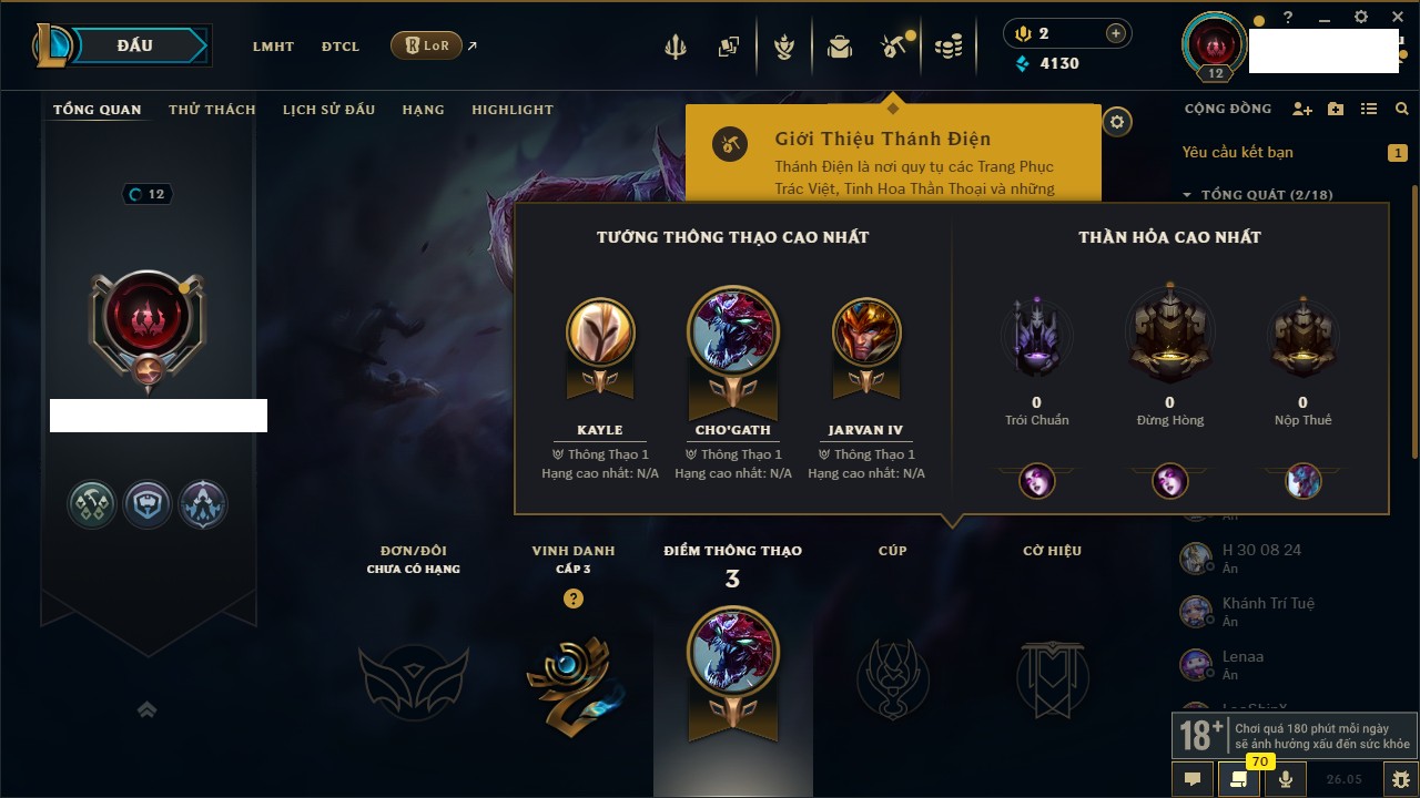 Rank Đơn: Chưa rank mùa nàoKhung: Chưa có khungTướng: 95 - Còn 3340 THXTrang Phục: 2Rank ĐTCL: Chưa RankLinh Thú: 32