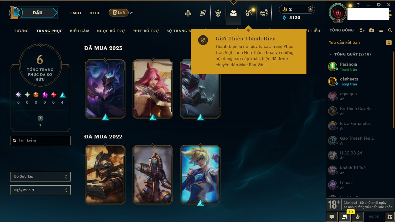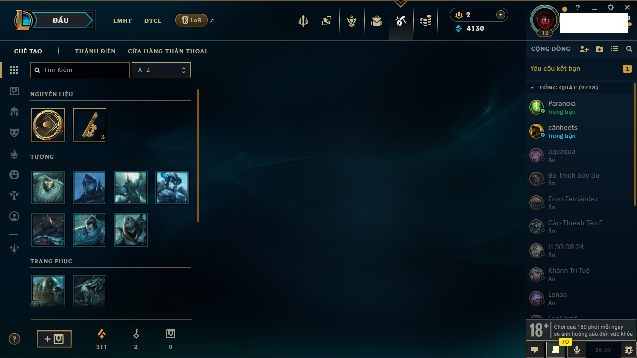 Rank Đơn: Chưa rank mùa nàoKhung: Chưa có khungTướng: 128 - Còn 16895 THXTrang Phục: 6Rank ĐTCL: Chưa RankLinh Thú: 10