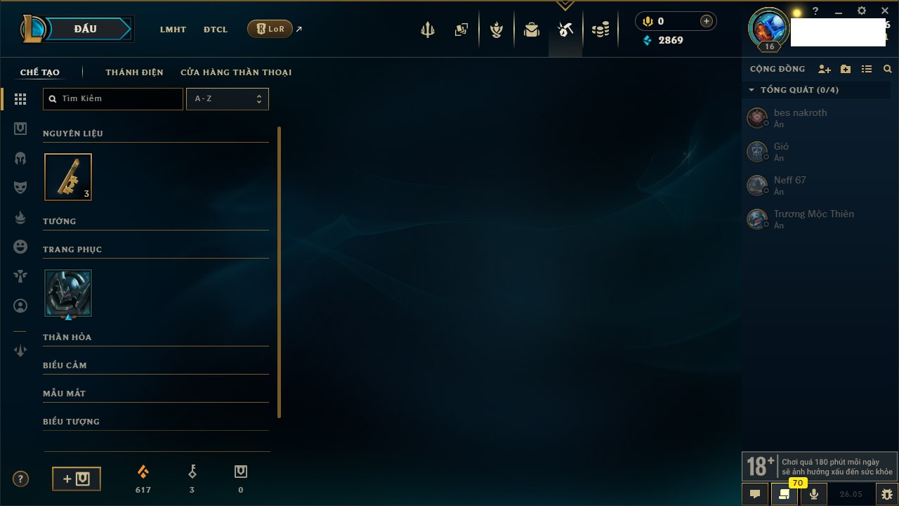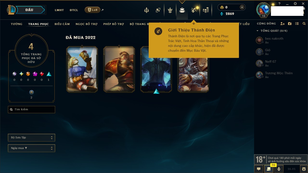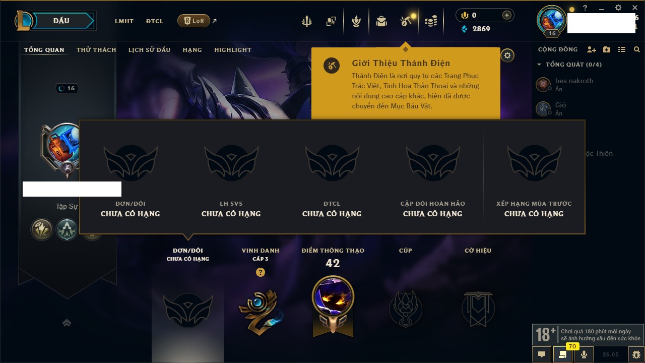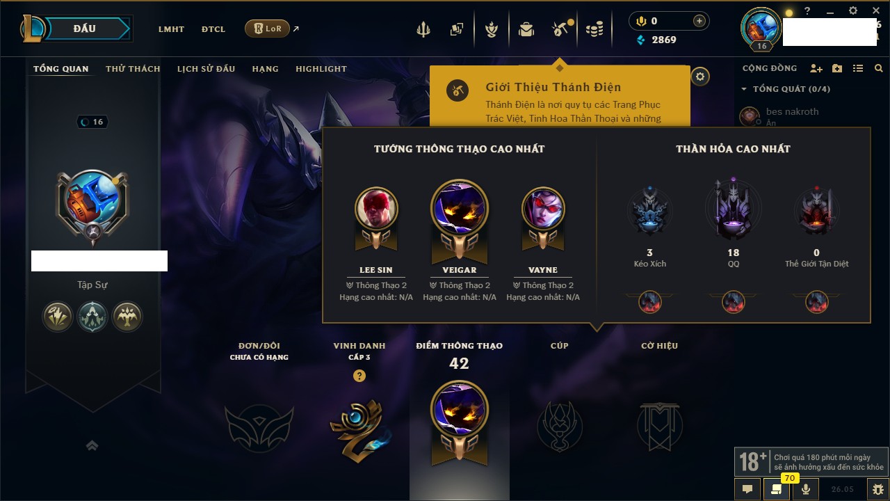 Rank Đơn: Chưa rank mùa nàoKhung: Chưa có khungTướng: 27 - Còn 2900 THXTrang Phục: 4Rank ĐTCL: Chưa RankLinh Thú: 24