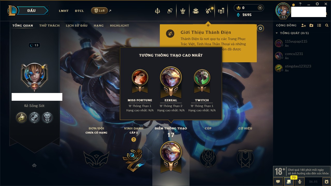 Rank Đơn: Chưa rank mùa nàoKhung: Chưa có khungTướng: 27 - Còn 2900 THXTrang Phục: 4Rank ĐTCL: Chưa RankLinh Thú: 24