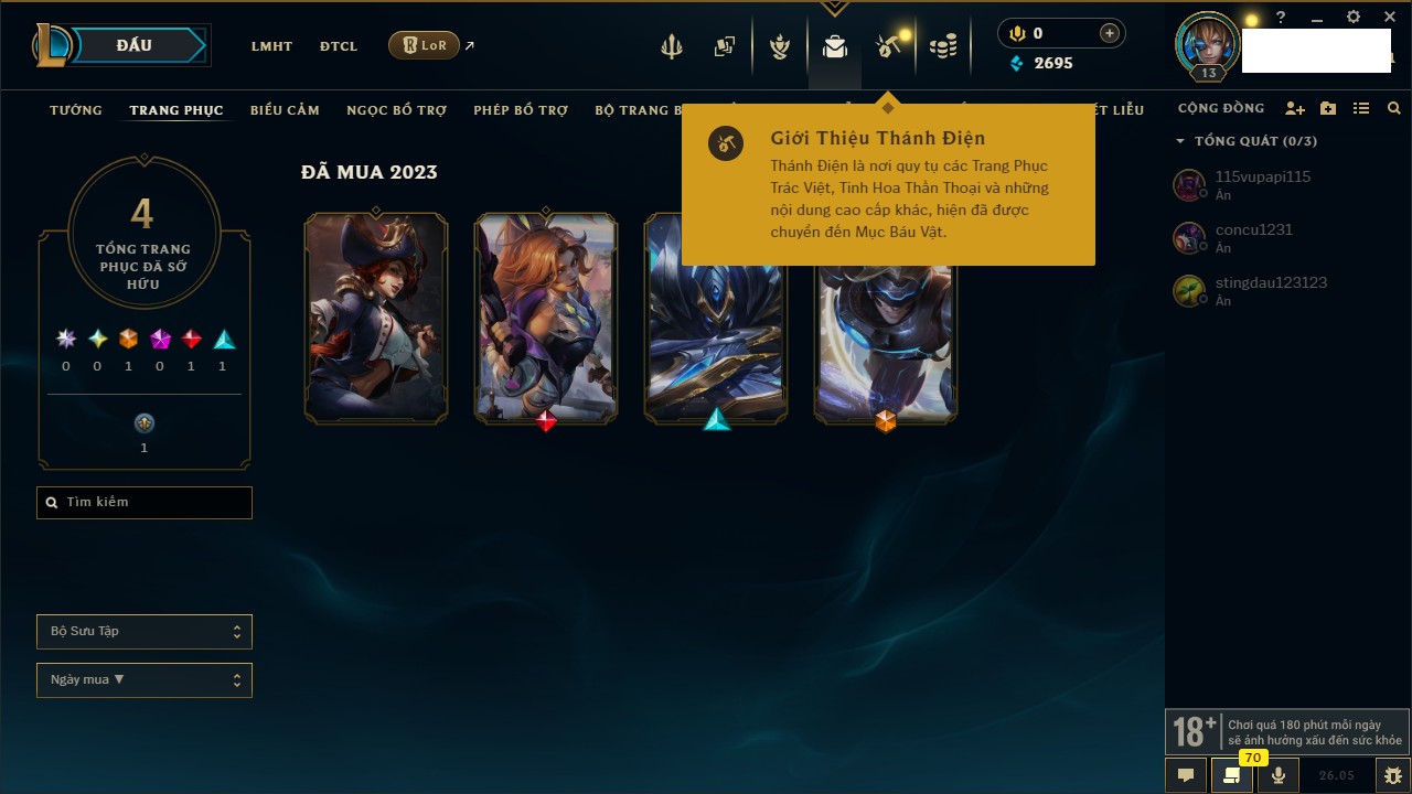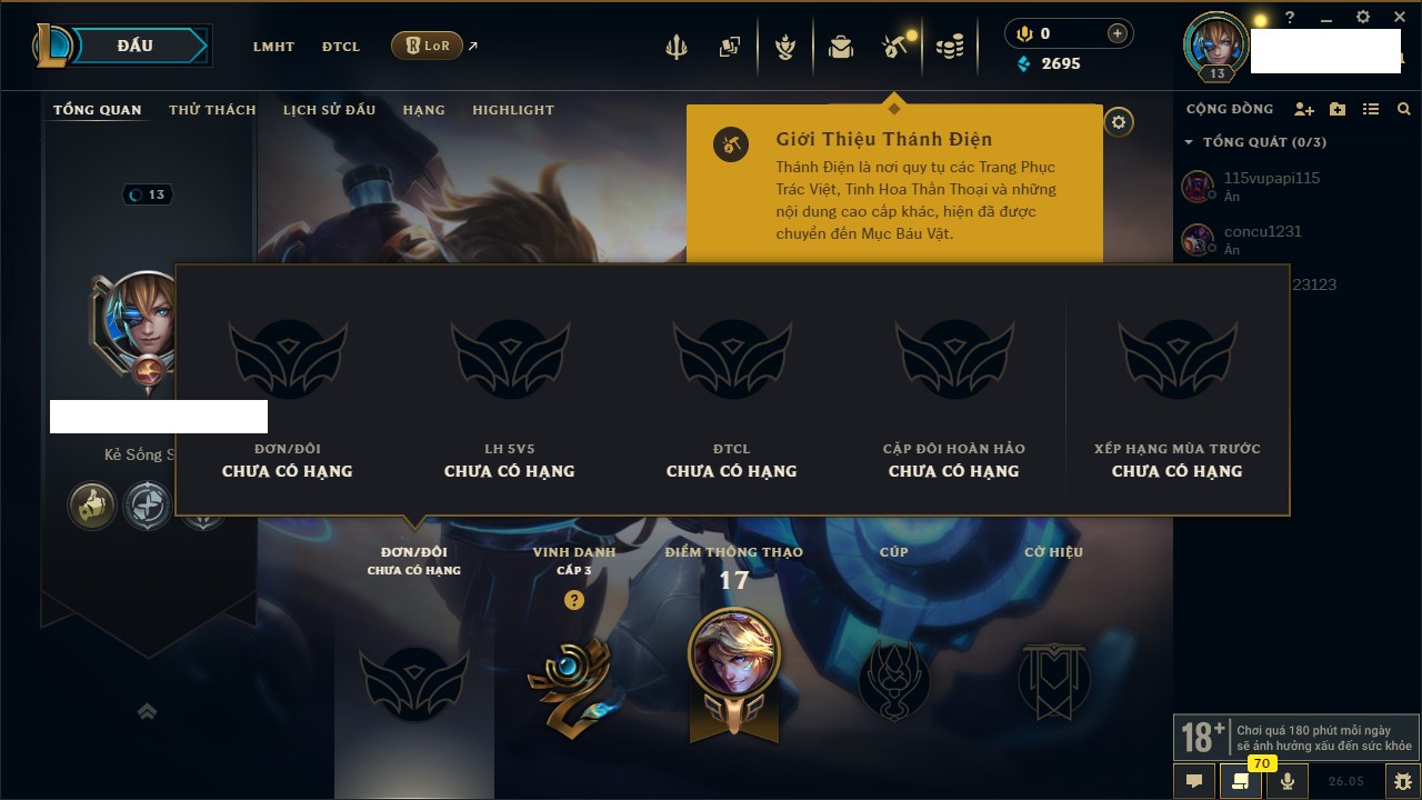 Rank Đơn: Chưa rank mùa nàoKhung: Chưa có khungTướng: 67 - Còn 2499 THXTrang Phục: 0Rank ĐTCL: Chưa RankLinh Thú: 12