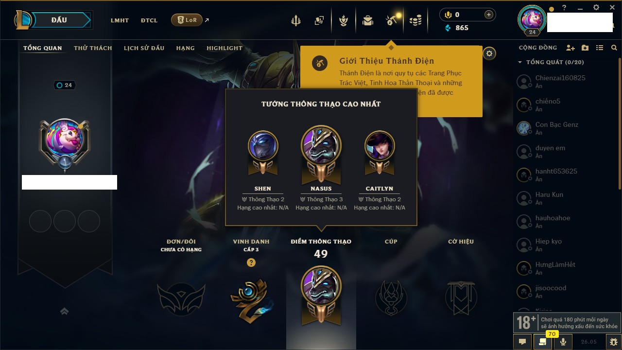 Rank Đơn: Chưa rank mùa nàoKhung: Chưa có khungTướng: 109 - Còn 17800 THXTrang Phục: 0Rank ĐTCL: Chưa RankLinh Thú: 25