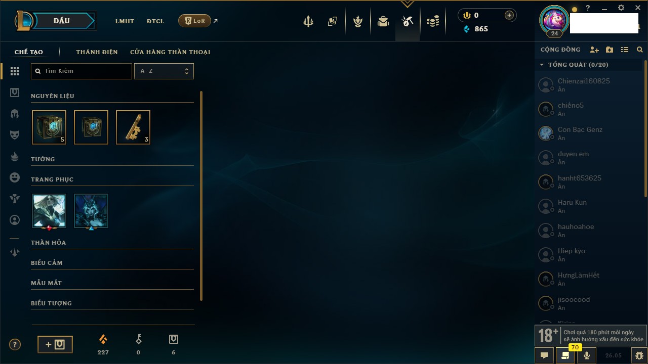 Rank Đơn: Chưa rank mùa nàoKhung: Chưa có khungTướng: 68 - Còn 3050 THXTrang Phục: 0Rank ĐTCL: Chưa RankLinh Thú: 9