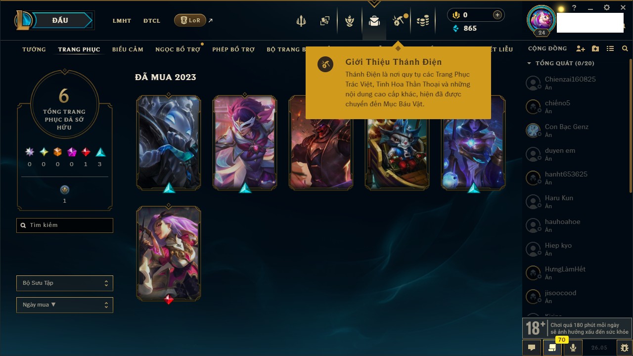 Rank Đơn: Chưa rank mùa nàoKhung: Chưa có khungTướng: 128 - Còn 16895 THXTrang Phục: 6Rank ĐTCL: Chưa RankLinh Thú: 10