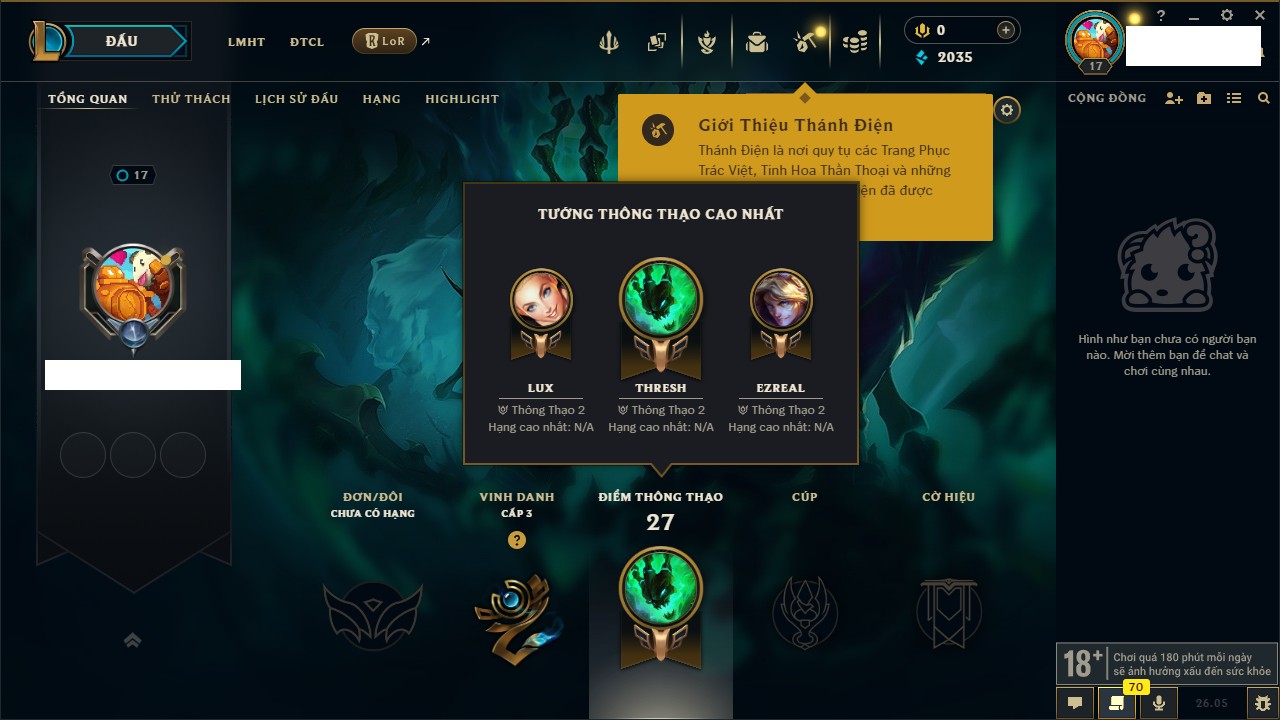 Rank Đơn: Chưa rank mùa nàoKhung: Chưa có khungTướng: 27 - Còn 2900 THXTrang Phục: 4Rank ĐTCL: Chưa RankLinh Thú: 24