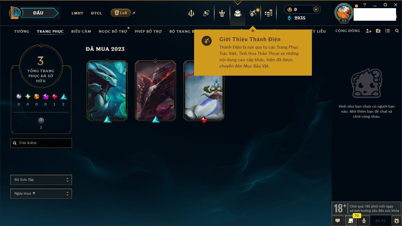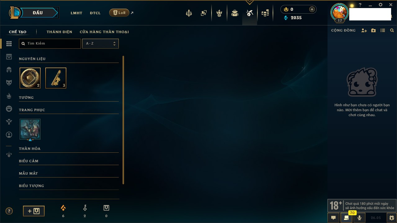 Rank Đơn: Chưa rank mùa nàoKhung: Chưa có khungTướng: 67 - Còn 2499 THXTrang Phục: 0Rank ĐTCL: Chưa RankLinh Thú: 12