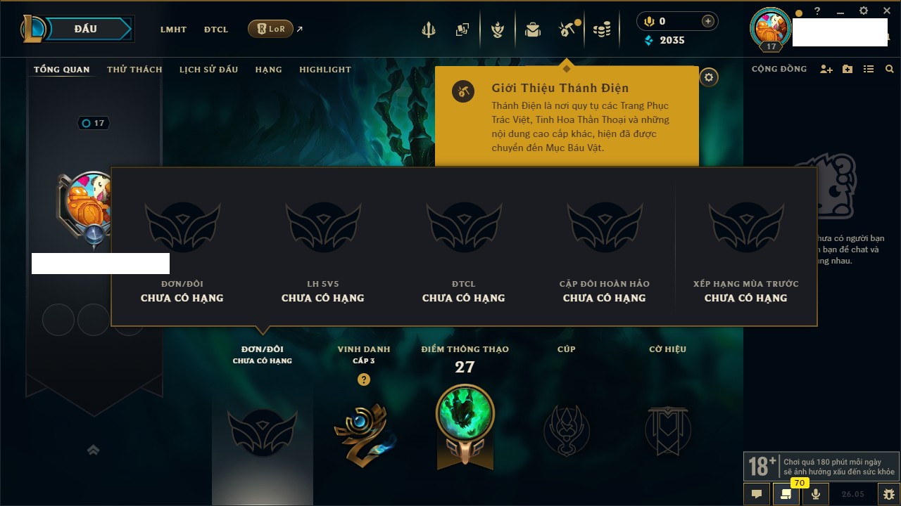 Rank Đơn: Chưa rank mùa nàoKhung: Chưa có khungTướng: 27 - Còn 1671 THXTrang Phục: 5Rank ĐTCL: Chưa RankLinh Thú: 6