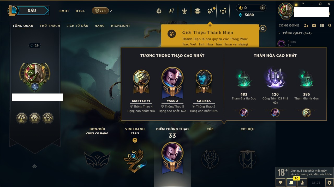 Rank Đơn: Chưa rank mùa nàoKhung: Chưa có khungTướng: 95 - Còn 3340 THXTrang Phục: 2Rank ĐTCL: Chưa RankLinh Thú: 32