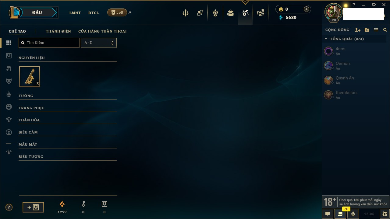 Rank Đơn: Chưa rank mùa nàoKhung: Chưa có khungTướng: 68 - Còn 3050 THXTrang Phục: 0Rank ĐTCL: Chưa RankLinh Thú: 9