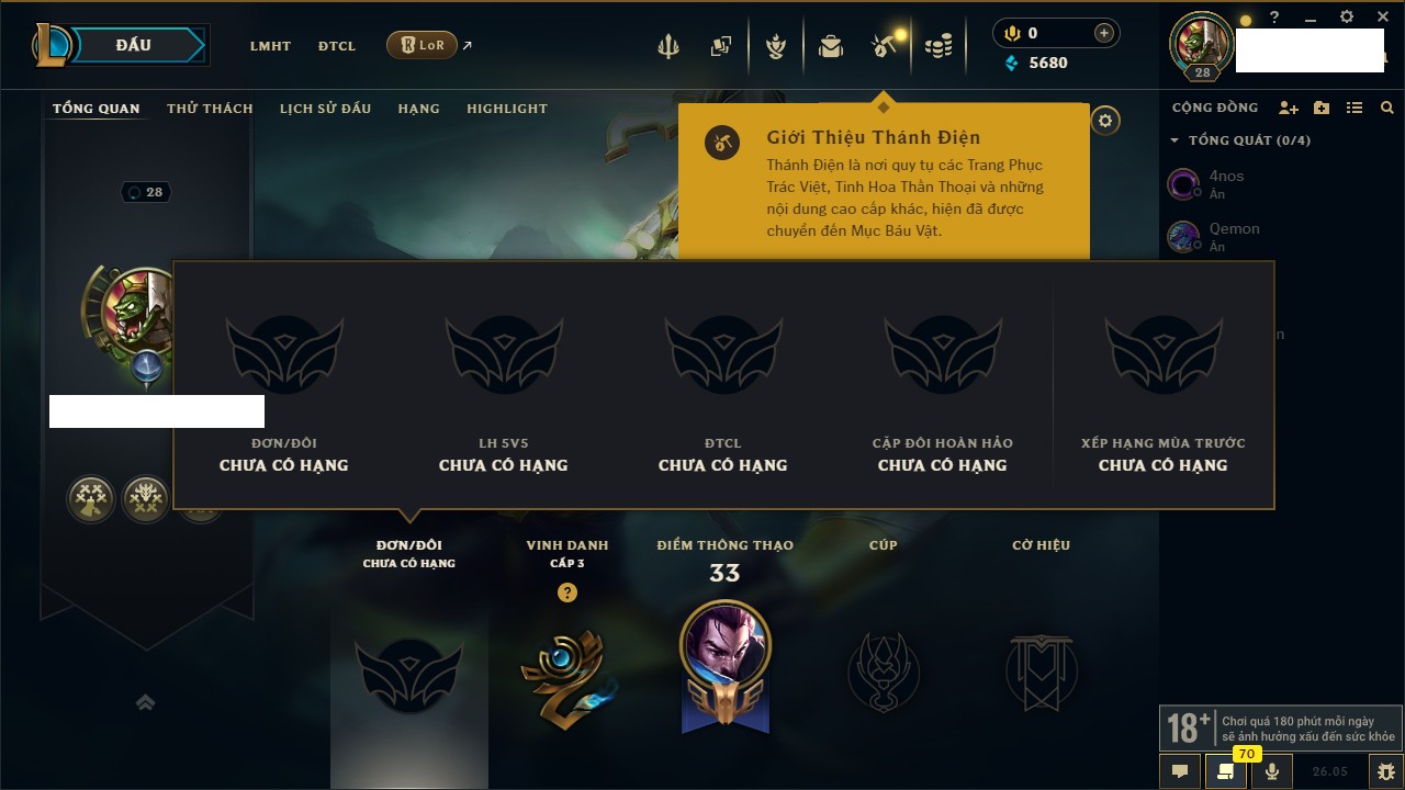 Rank Đơn: Chưa rank mùa nàoKhung: Chưa có khungTướng: 109 - Còn 17800 THXTrang Phục: 0Rank ĐTCL: Chưa RankLinh Thú: 25