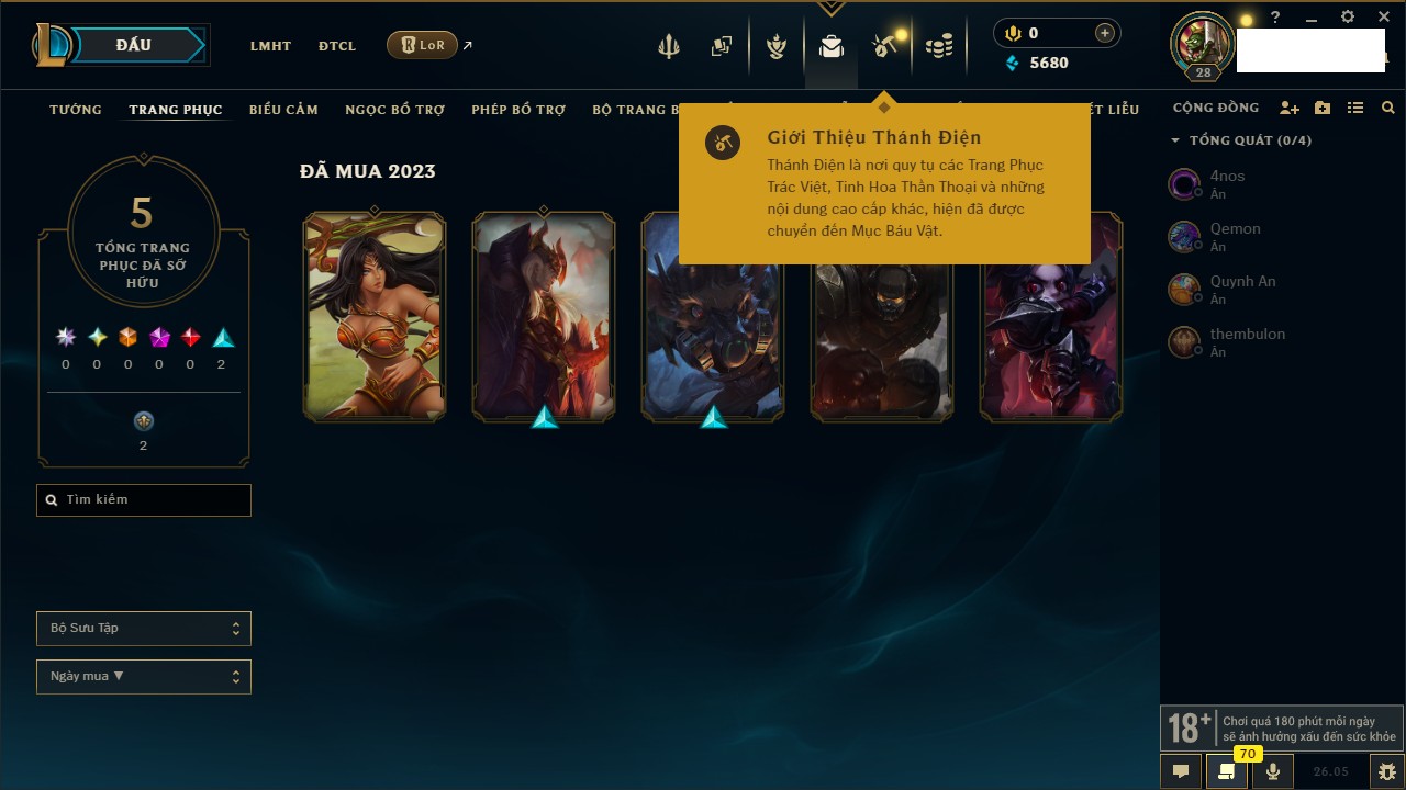 Rank Đơn: Chưa rank mùa nàoKhung: Chưa có khungTướng: 128 - Còn 16895 THXTrang Phục: 6Rank ĐTCL: Chưa RankLinh Thú: 10