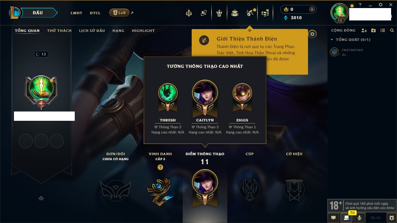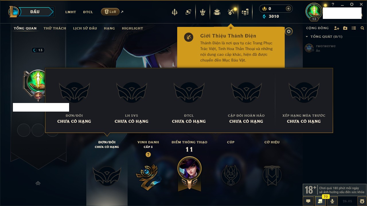Rank Đơn: Chưa rank mùa nàoKhung: Chưa có khungTướng: 51 - Còn 3010 THXTrang Phục: 0Rank ĐTCL: Chưa RankLinh Thú: 9