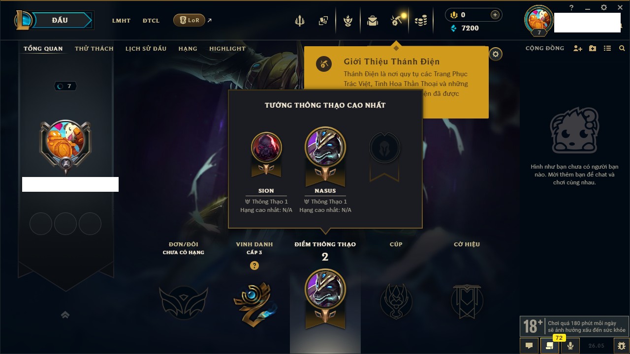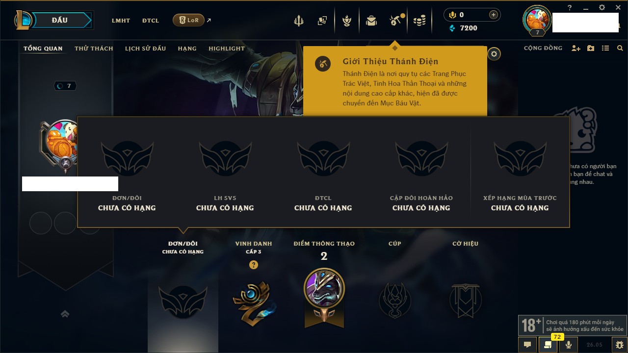 Rank Đơn: Chưa rank mùa nàoKhung: Chưa có khungTướng: 67 - Còn 6000 THXTrang Phục: 0Rank ĐTCL: Chưa RankLinh Thú: 5