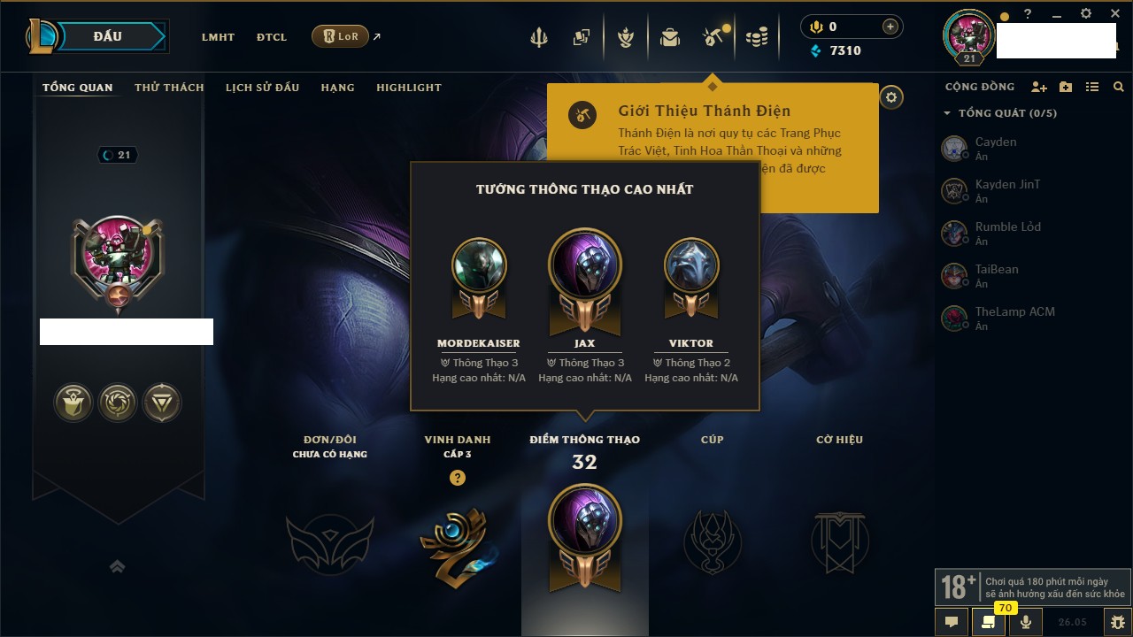 Rank Đơn: Chưa rank mùa nàoKhung: Chưa có khungTướng: 27 - Còn 1671 THXTrang Phục: 5Rank ĐTCL: Chưa RankLinh Thú: 6