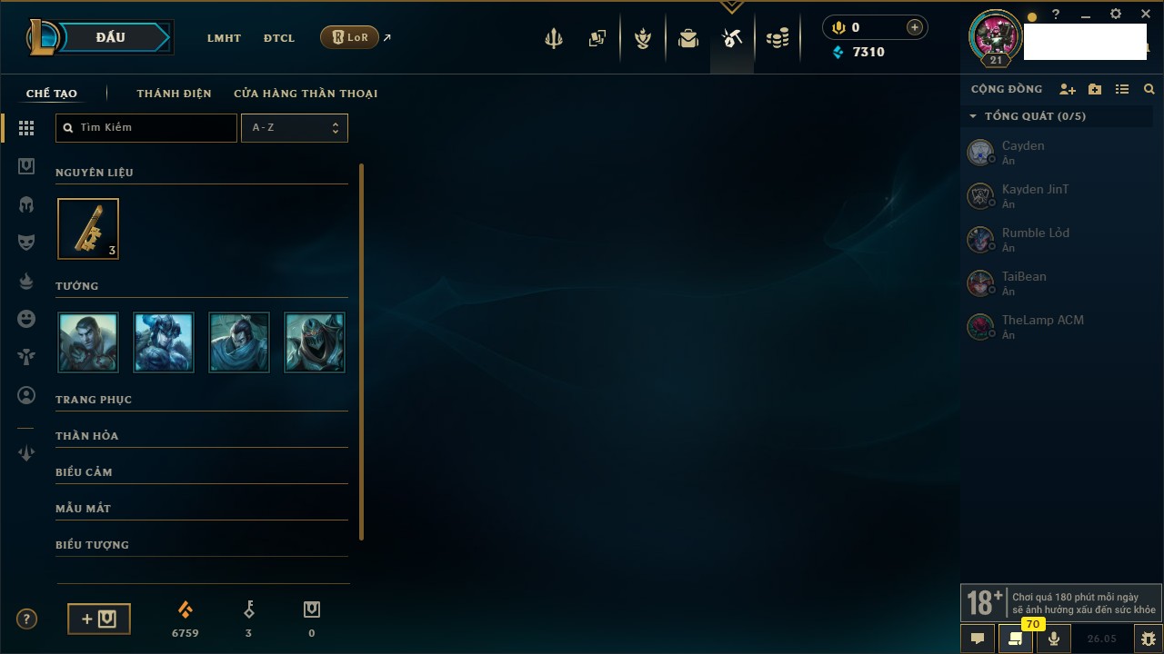 Rank Đơn: Chưa rank mùa nàoKhung: Chưa có khungTướng: 51 - Còn 7470 THXTrang Phục: 3Rank ĐTCL: Chưa RankLinh Thú: 26