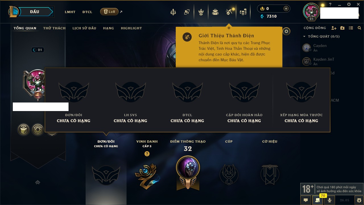 Rank Đơn: Chưa rank mùa nàoKhung: Chưa có khungTướng: 66 - Còn 2350 THXTrang Phục: 0Rank ĐTCL: Chưa RankLinh Thú: 13