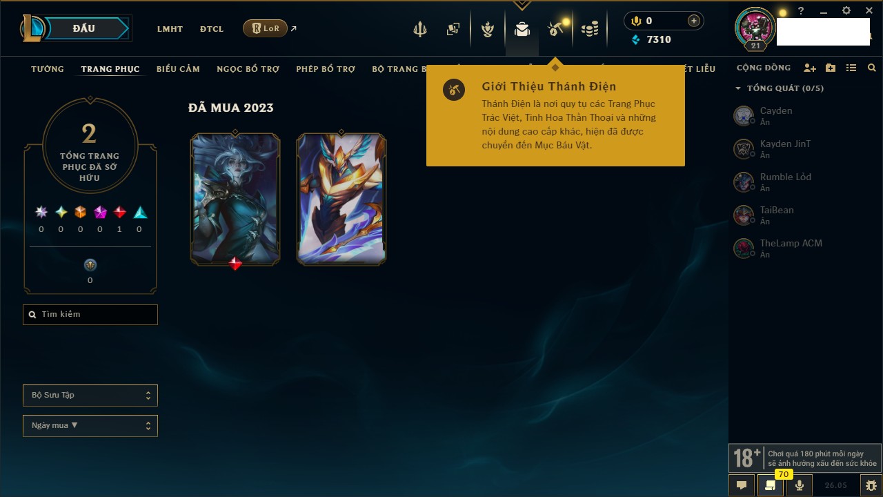 Rank Đơn: Chưa rank mùa nàoKhung: Chưa có khungTướng: 27 - Còn 2900 THXTrang Phục: 4Rank ĐTCL: Chưa RankLinh Thú: 24