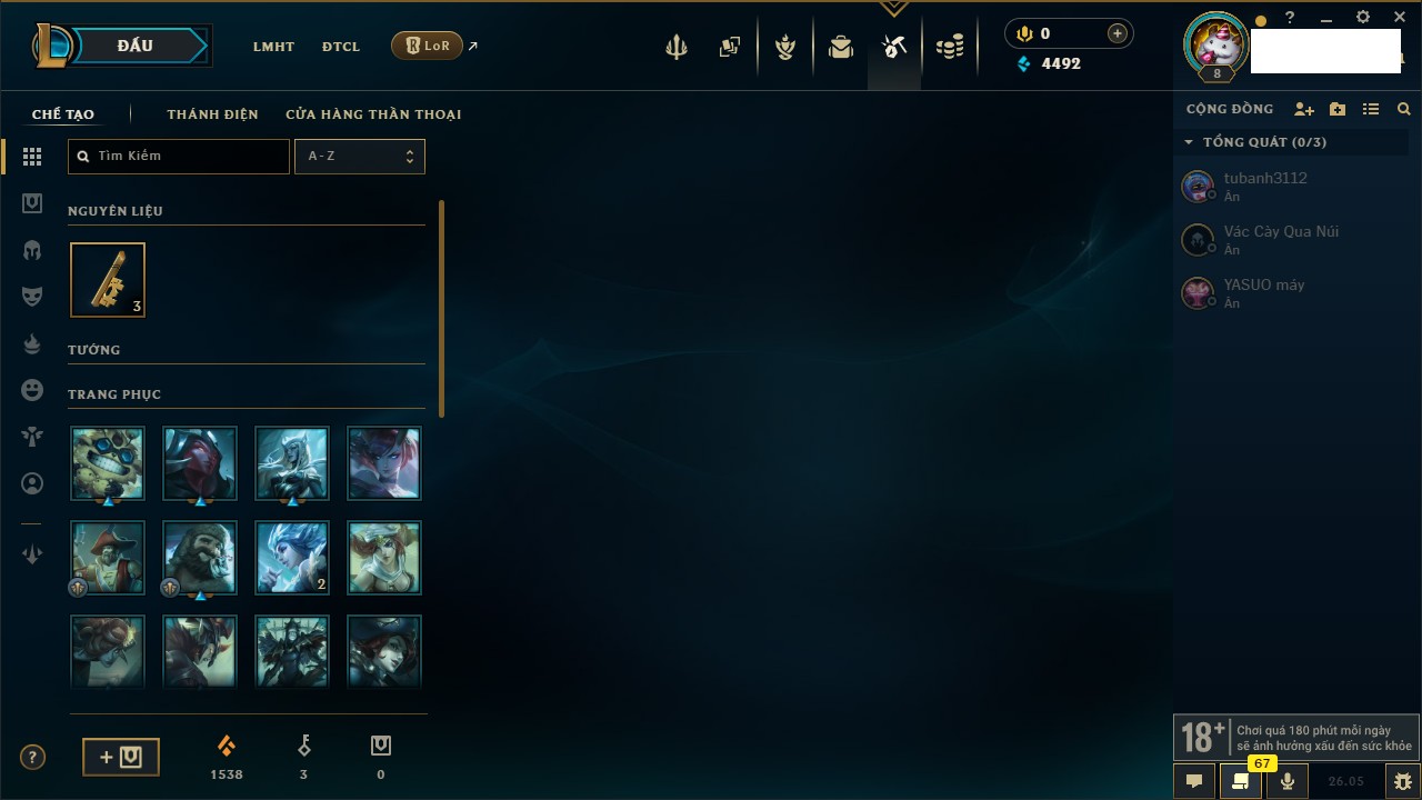 Rank Đơn: Chưa rank mùa nào Khung: Chưa có khung Tướng: 150 - Còn 4492 THX Trang Phục: 7 Rank ĐTCL: Chưa Rank Linh Thú: 14