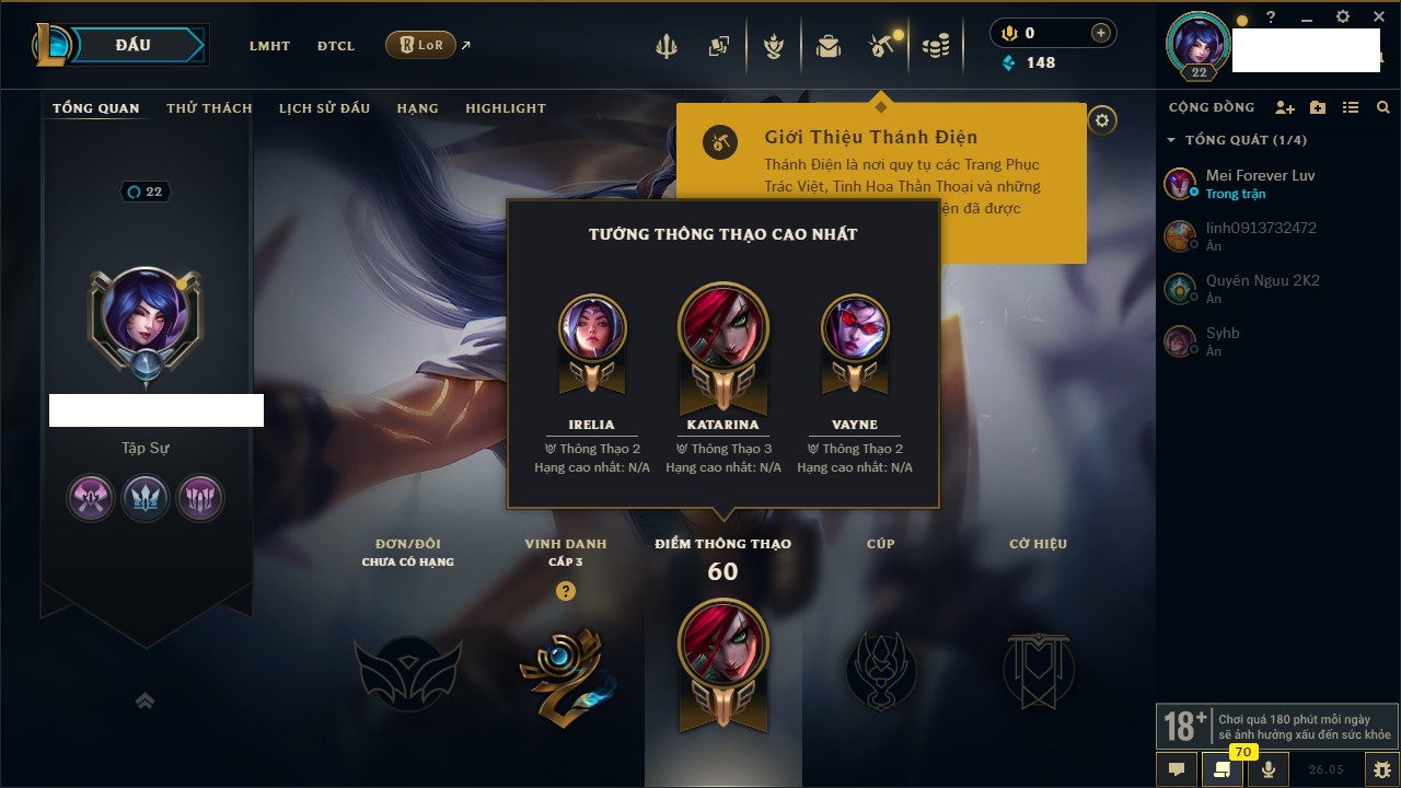 Rank Đơn: Chưa rank mùa nàoKhung: Chưa có khungTướng: 157 - Còn 2915 THXTrang Phục: 7Rank ĐTCL: Chưa RankLinh Thú: 5