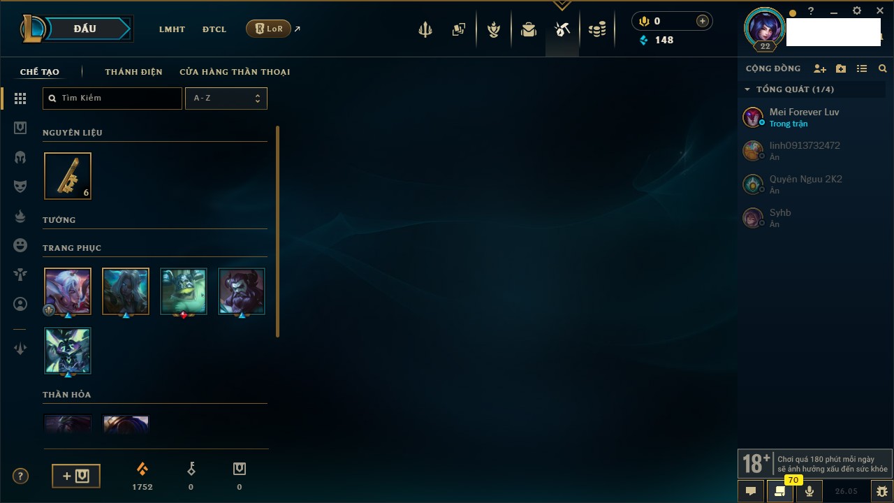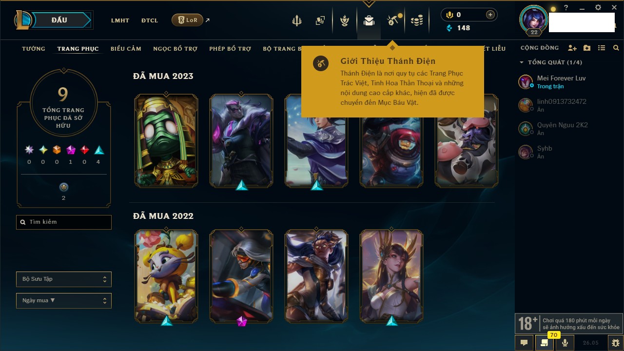 Rank Đơn: Chưa rank mùa nàoKhung: Chưa có khungTướng: 152 - Còn 8255 THXTrang Phục: 7Rank ĐTCL: Chưa RankLinh Thú: 37