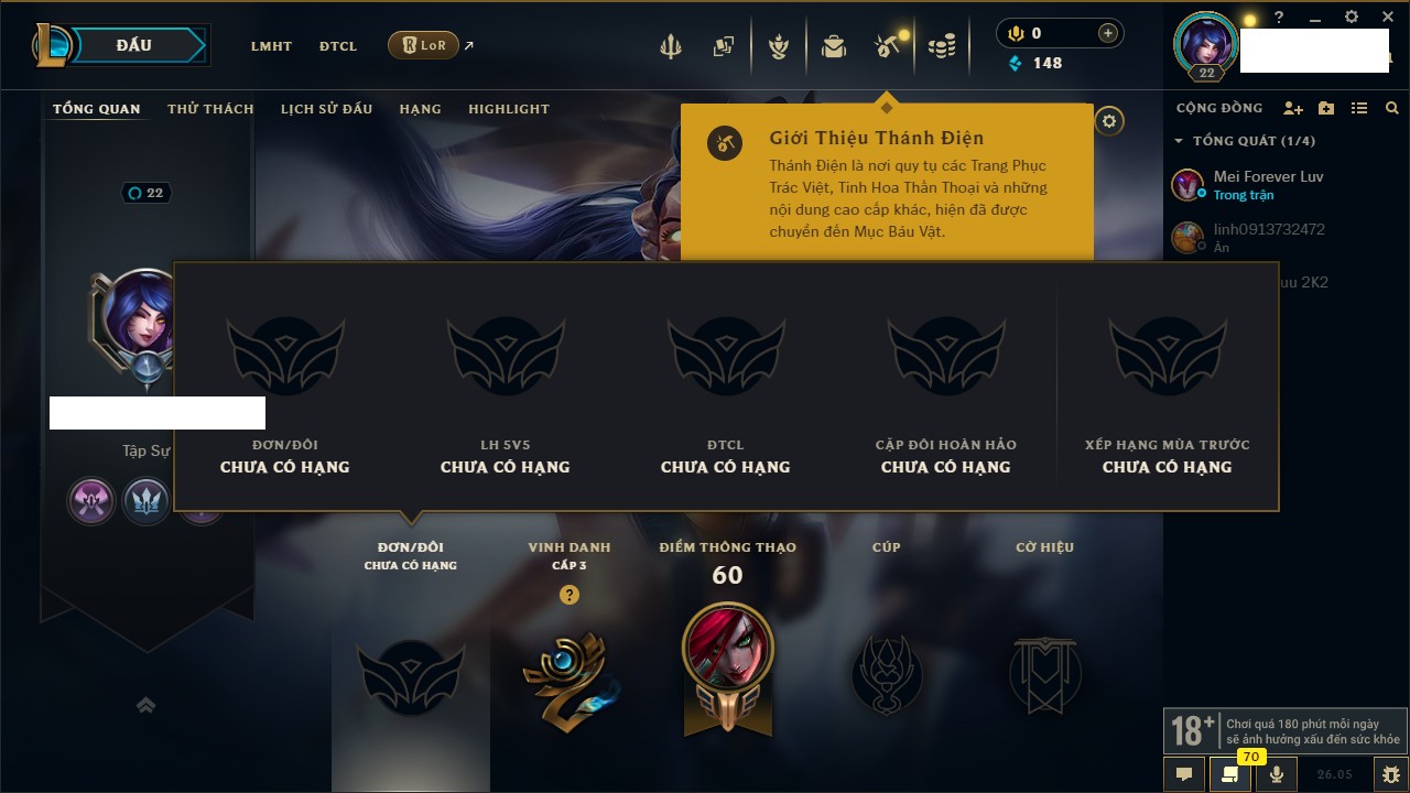 Rank Đơn: Chưa rank mùa nàoKhung: Chưa có khungTướng: 5 - Còn 6300 THXTrang Phục: 0Rank ĐTCL: Bạc IIILinh Thú: 17
