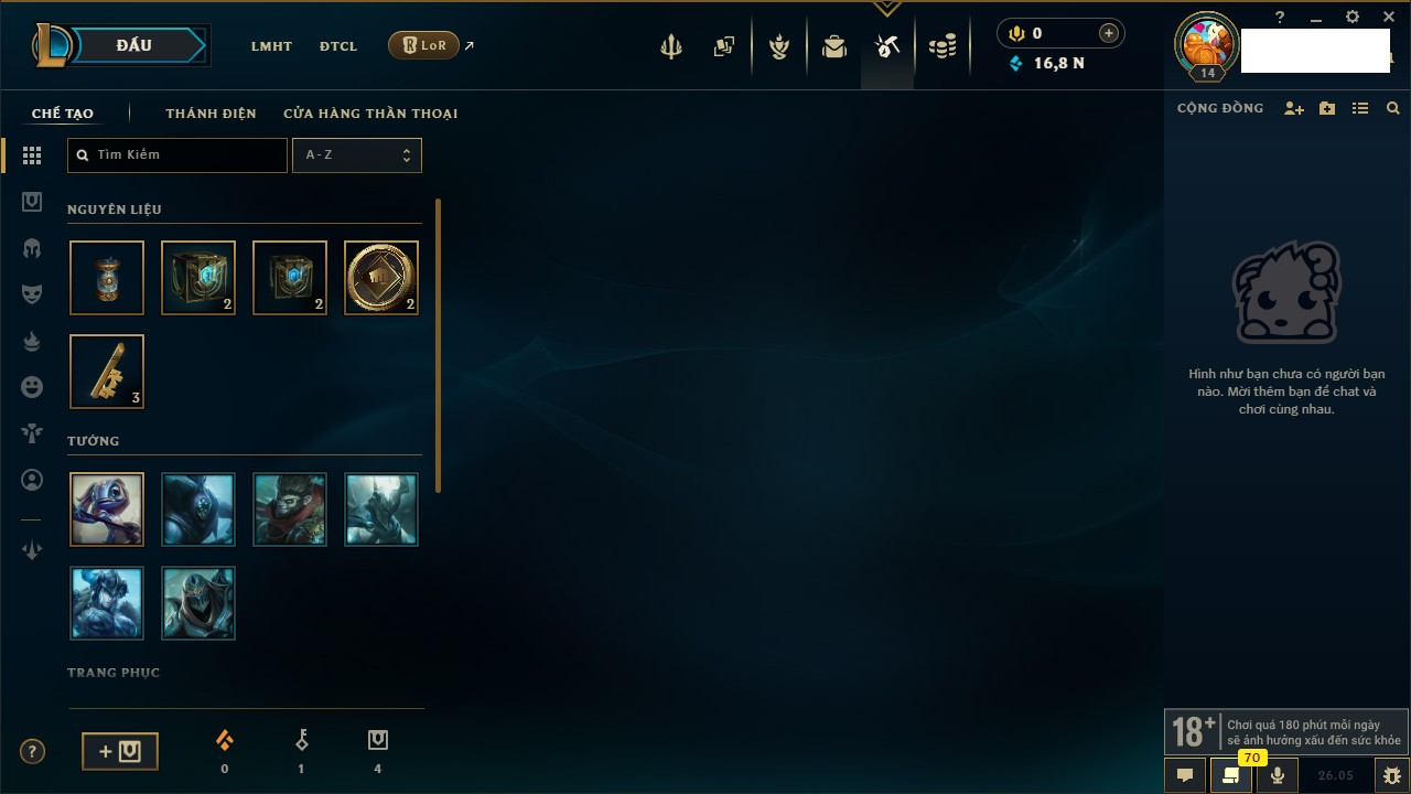 Rank Đơn: Chưa rank mùa nàoKhung: Chưa có khungTướng: 70 - Còn 7630 THXTrang Phục: 0Rank ĐTCL: Chưa RankLinh Thú: 5