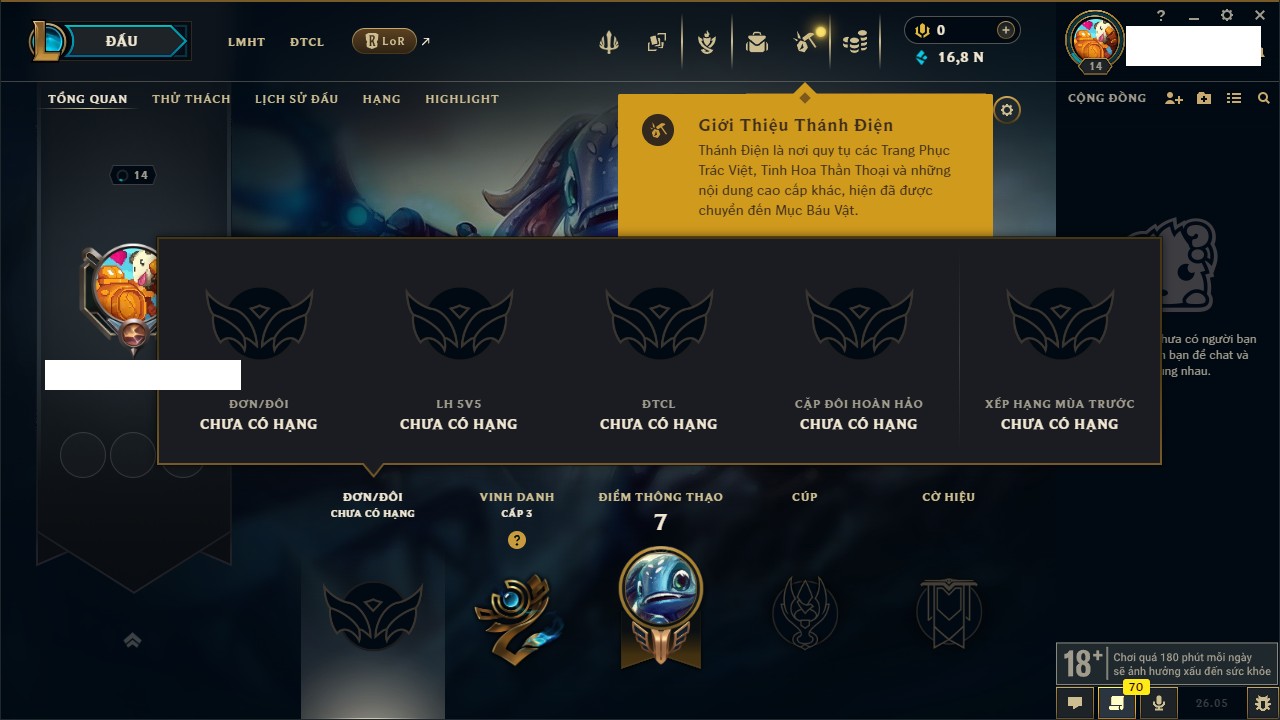 Rank Đơn: Chưa rank mùa nàoKhung: Chưa có khungTướng: 67 - Còn 6000 THXTrang Phục: 0Rank ĐTCL: Chưa RankLinh Thú: 5