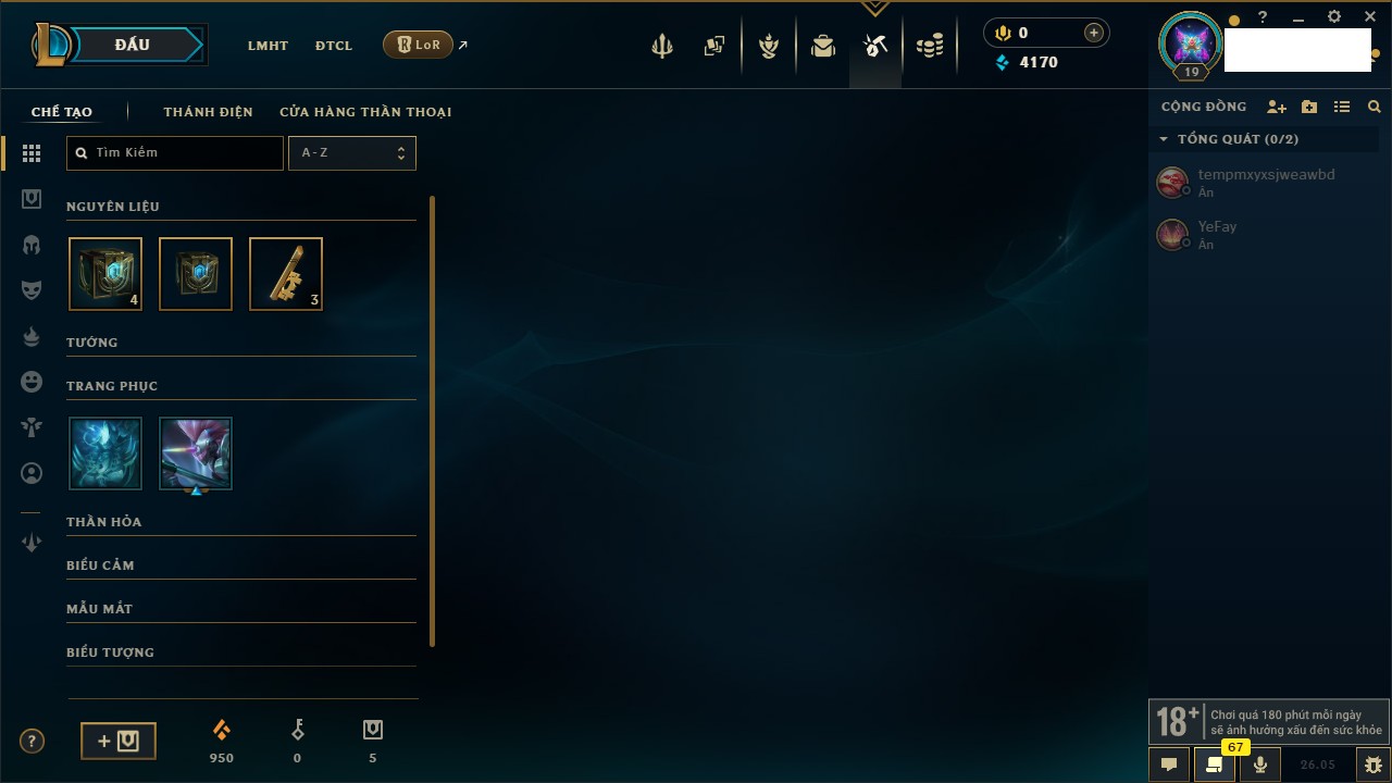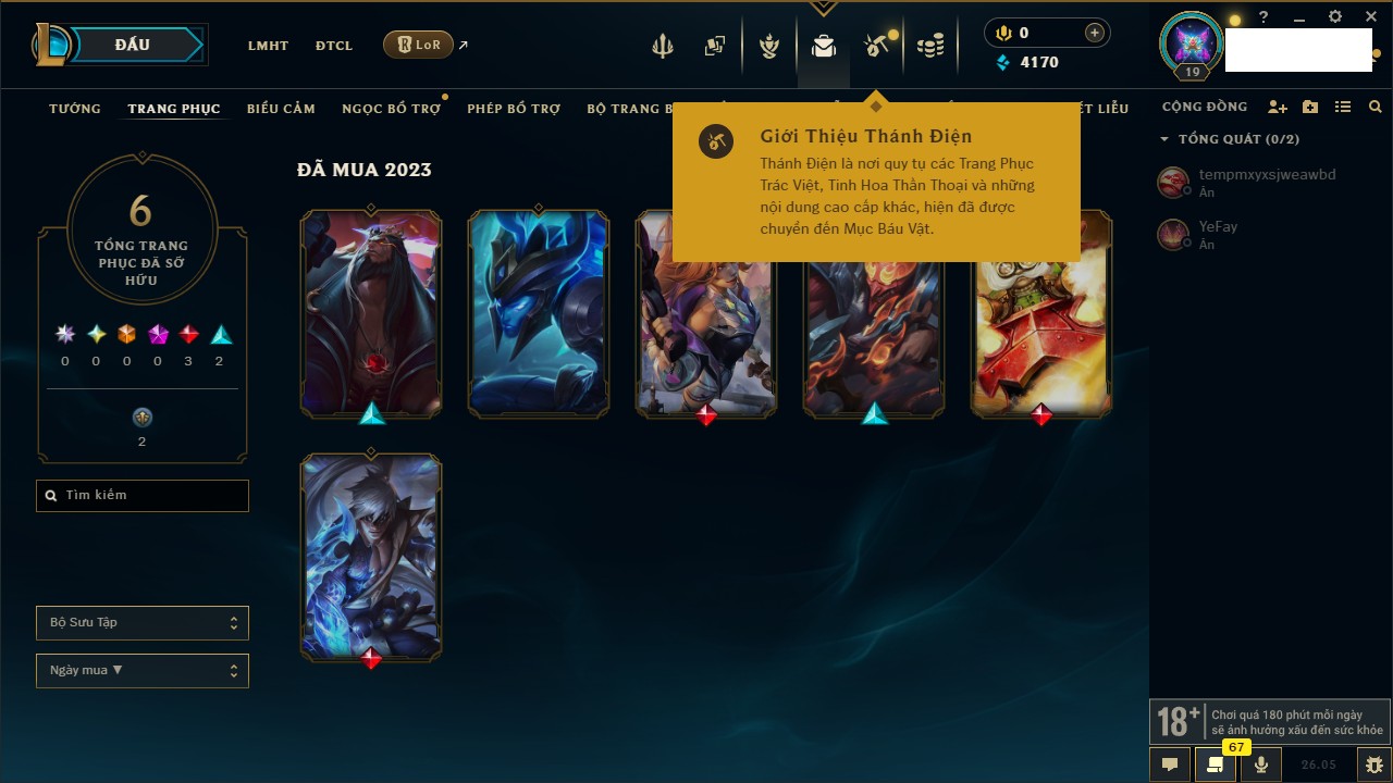 Rank Đơn: Chưa rank mùa nàoKhung: Chưa có khungTướng: 148 - Còn 1440 THXTrang Phục: 2Rank ĐTCL: Chưa RankLinh Thú: 6