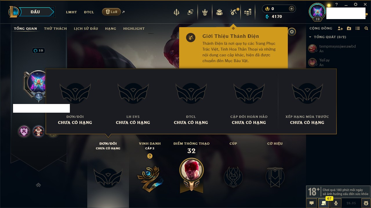 Rank Đơn: Chưa rank mùa nàoKhung: Chưa có khungTướng: 75 - Còn 4373 THXTrang Phục: 1Rank ĐTCL: Chưa RankLinh Thú: 25