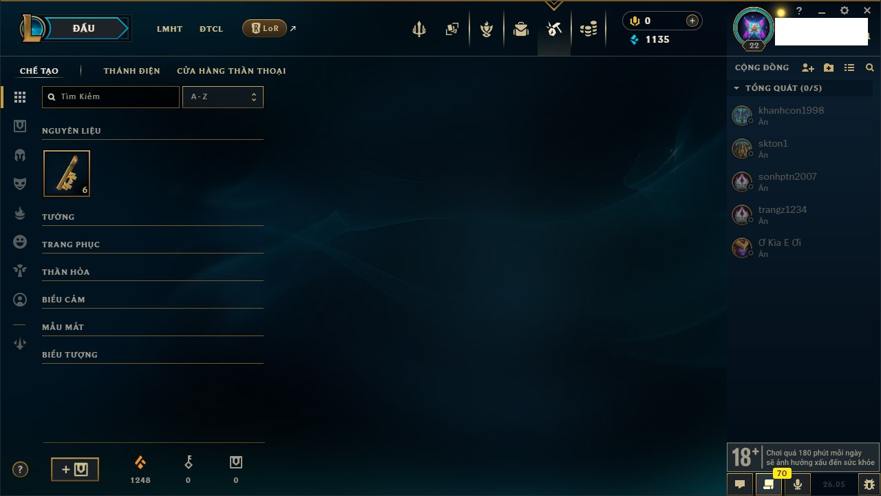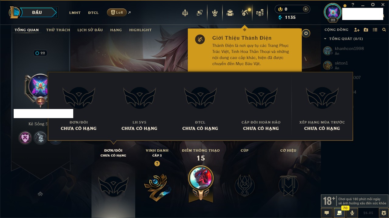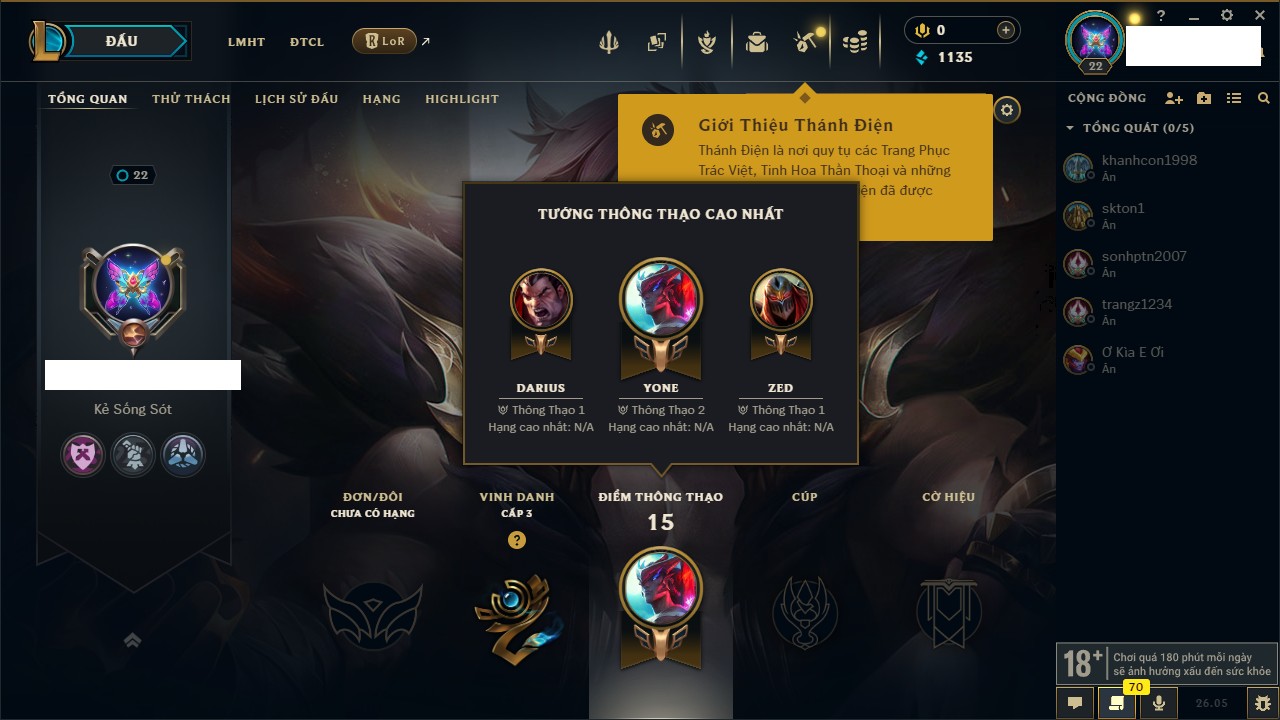 Rank Đơn: Chưa rank mùa nàoKhung: Chưa có khungTướng: 67 - Còn 6000 THXTrang Phục: 0Rank ĐTCL: Chưa RankLinh Thú: 5