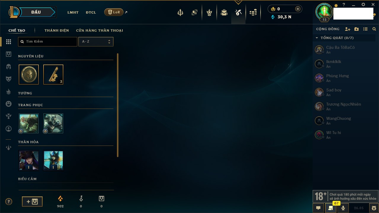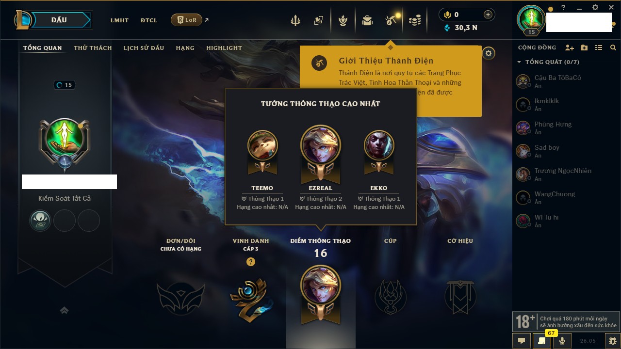 Rank Đơn: Chưa rank mùa nàoKhung: Chưa có khungTướng: 1 - Còn 3000 THXTrang Phục: 0Rank ĐTCL: Chưa RankLinh Thú: 10
