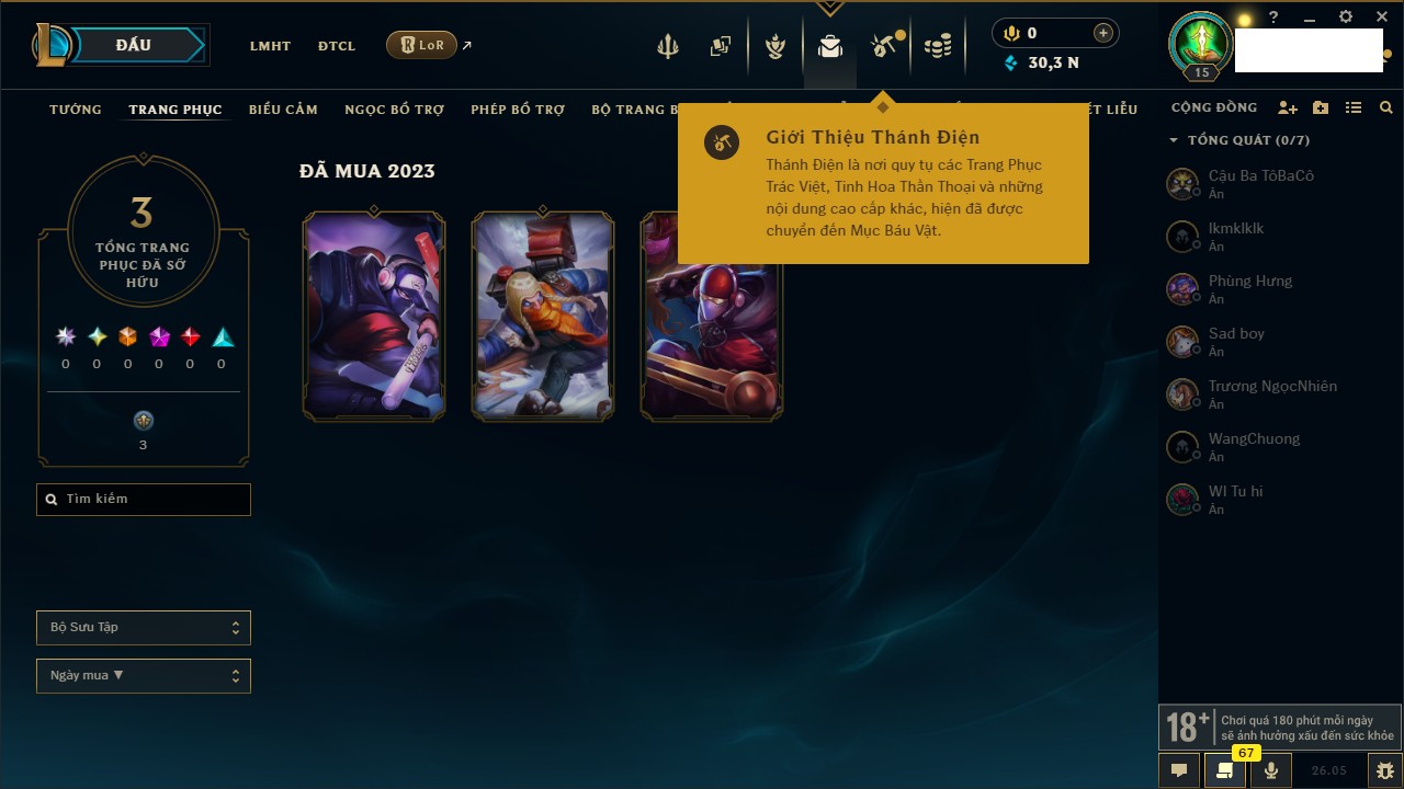 Rank Đơn: Chưa rank mùa nàoKhung: Chưa có khungTướng: 158 - Còn 23070 THXTrang Phục: 4Rank ĐTCL: Chưa RankLinh Thú: 76