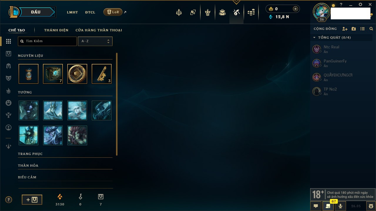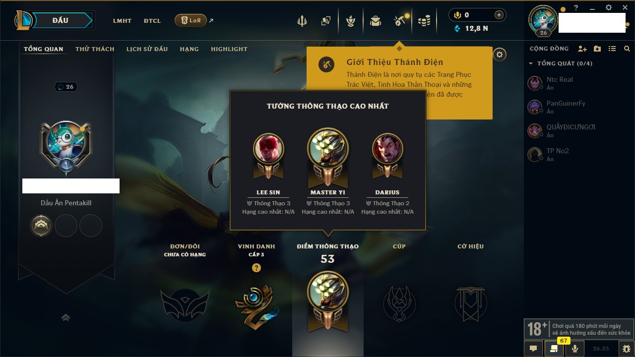 Rank Đơn: Chưa rank mùa nàoKhung: Chưa có khungTướng: 131 - Còn 12830 THXTrang Phục: 8Rank ĐTCL: Chưa RankLinh Thú: 6