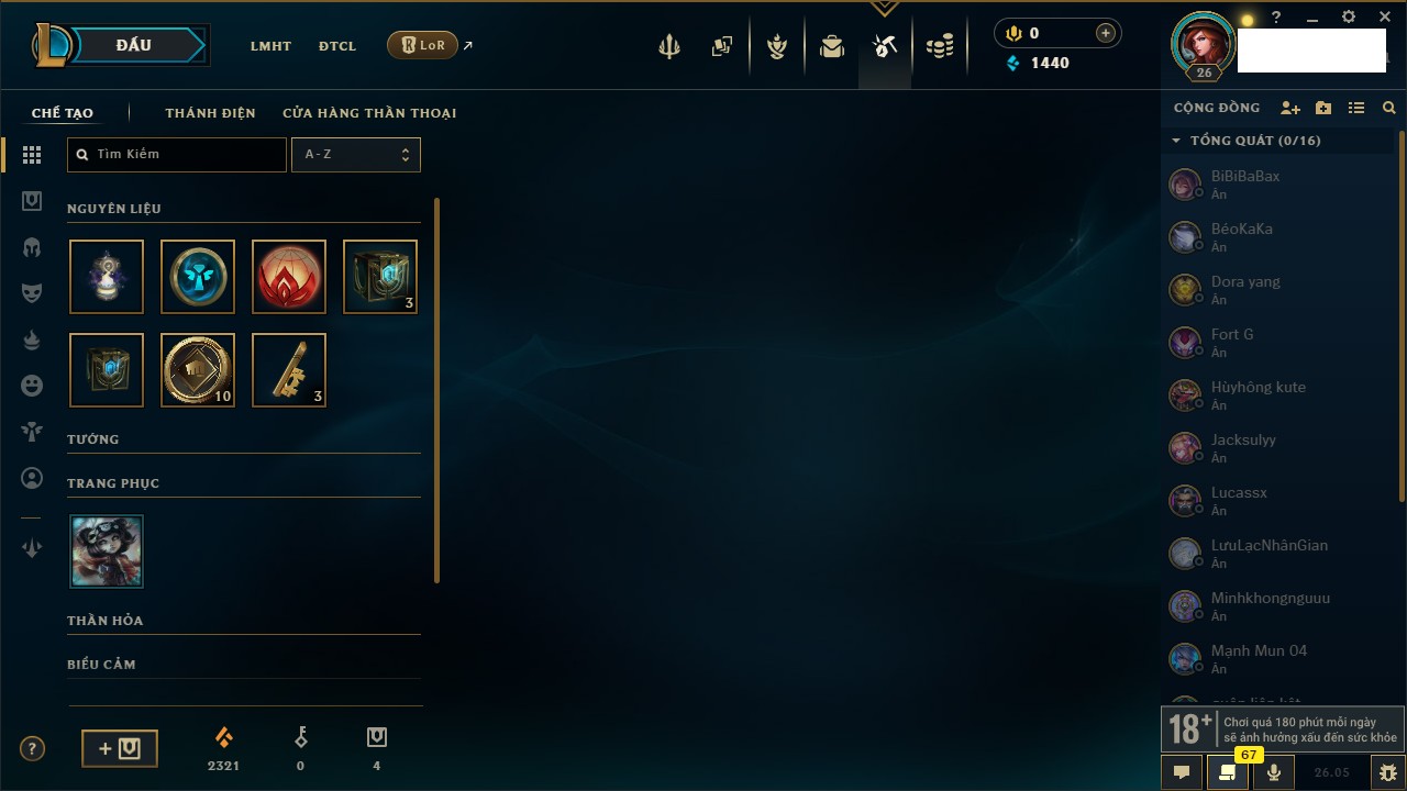 Rank Đơn: Chưa rank mùa nàoKhung: Chưa có khungTướng: 148 - Còn 1440 THXTrang Phục: 2Rank ĐTCL: Chưa RankLinh Thú: 6