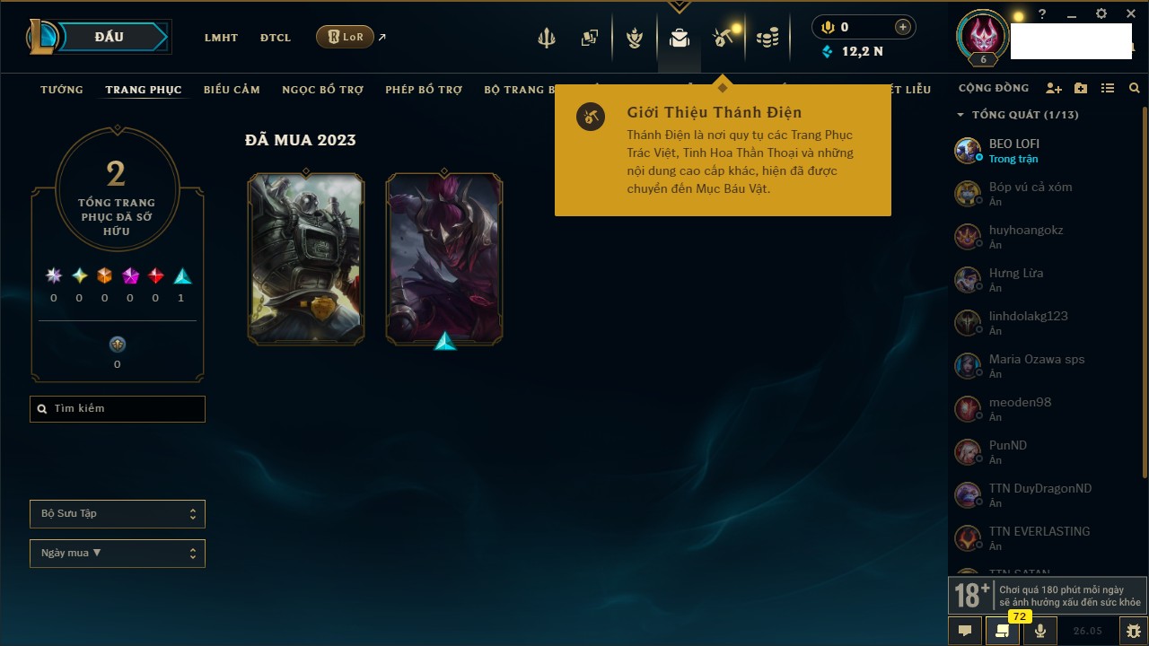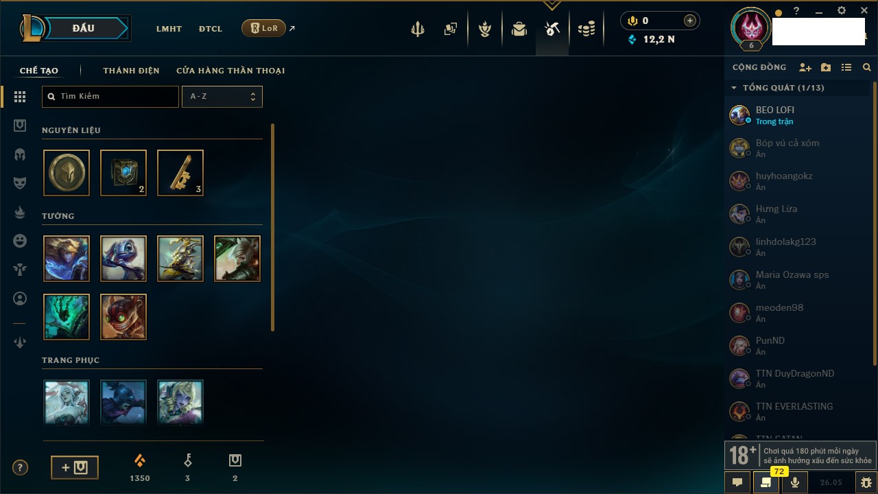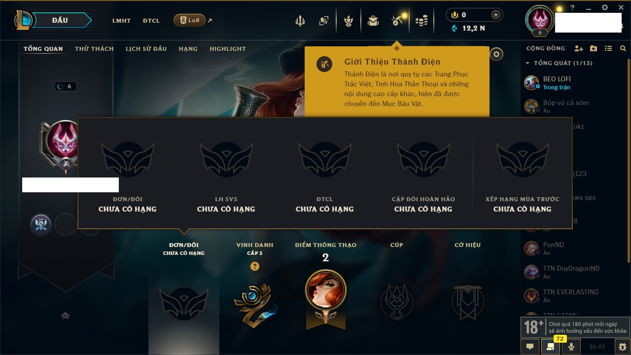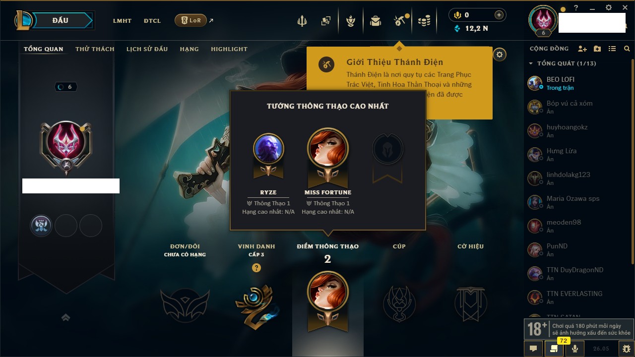 Rank Đơn: Chưa rank mùa nàoKhung: Chưa có khungTướng: 67 - Còn 2499 THXTrang Phục: 0Rank ĐTCL: Chưa RankLinh Thú: 12