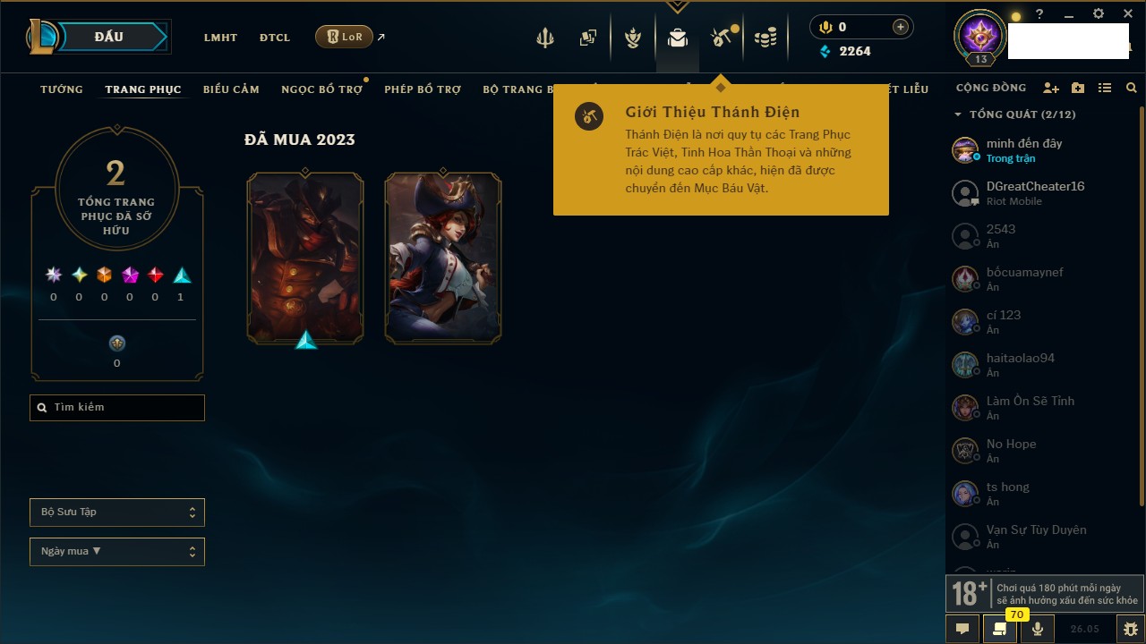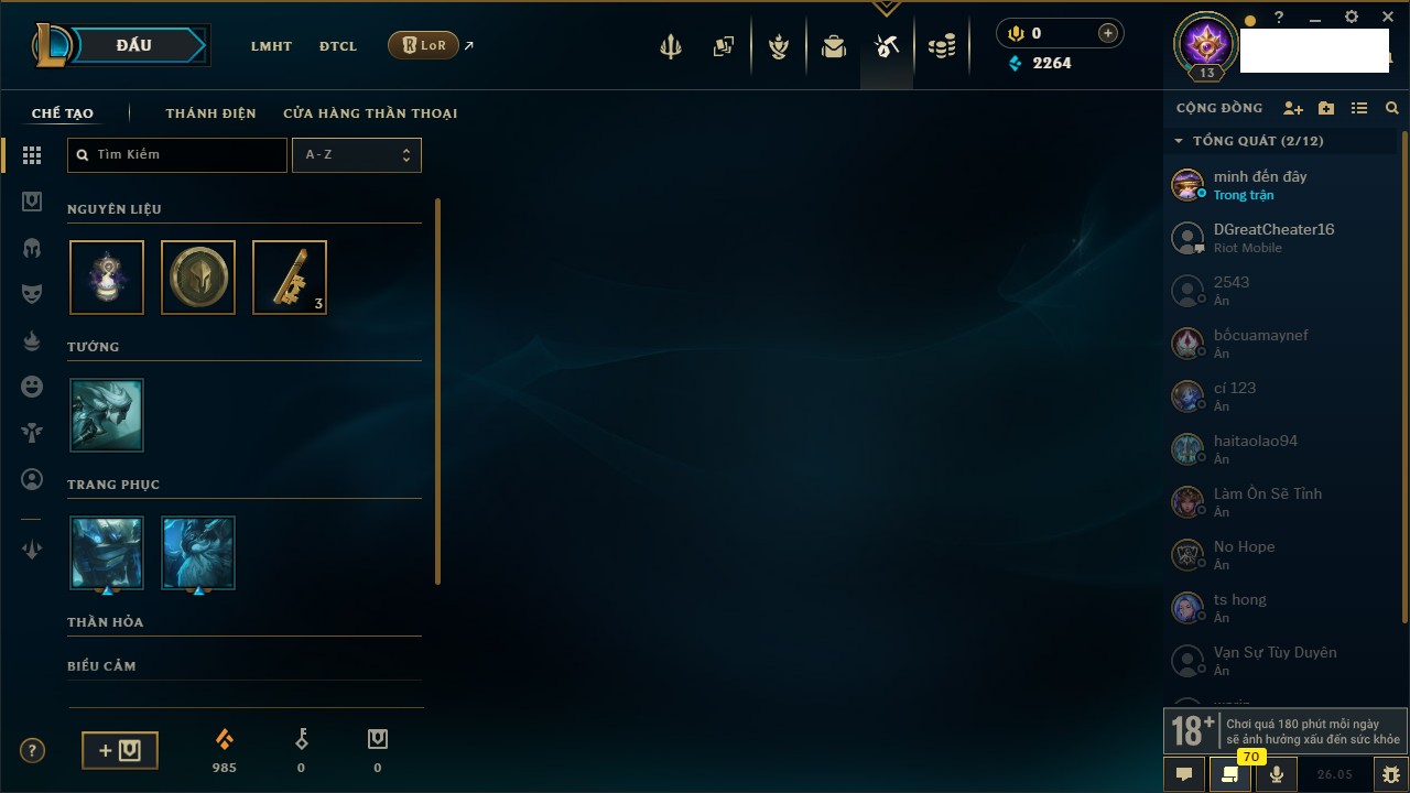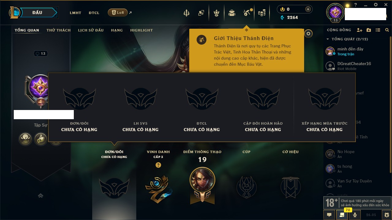 Rank Đơn: Chưa rank mùa nàoKhung: Chưa có khungTướng: 67 - Còn 2499 THXTrang Phục: 0Rank ĐTCL: Chưa RankLinh Thú: 12