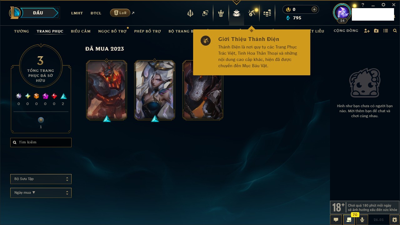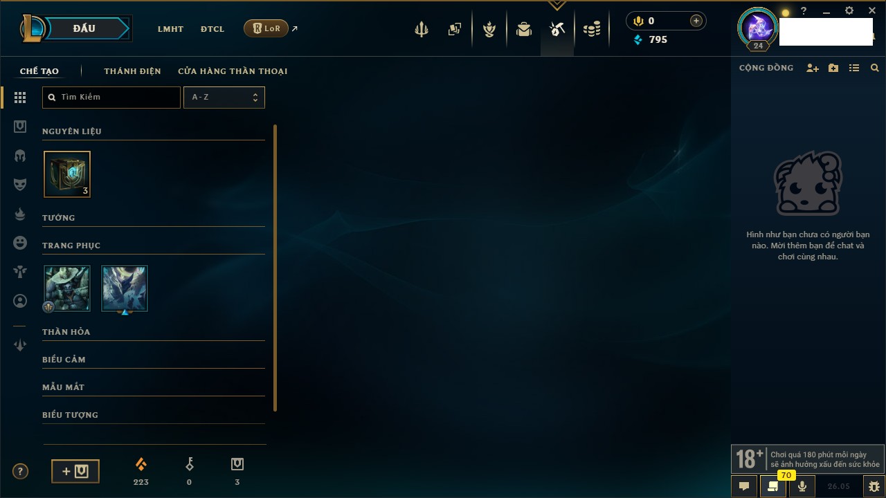 Rank Đơn: Chưa rank mùa nàoKhung: Chưa có khungTướng: 67 - Còn 2499 THXTrang Phục: 0Rank ĐTCL: Chưa RankLinh Thú: 12