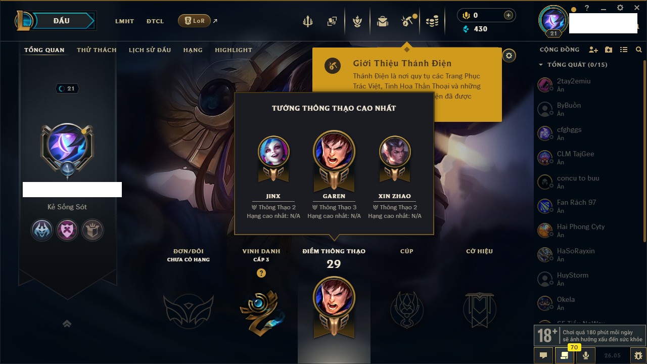 Rank Đơn: Chưa rank mùa nàoKhung: Chưa có khungTướng: 27 - Còn 2900 THXTrang Phục: 4Rank ĐTCL: Chưa RankLinh Thú: 24
