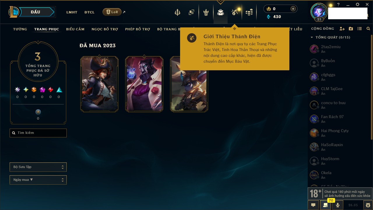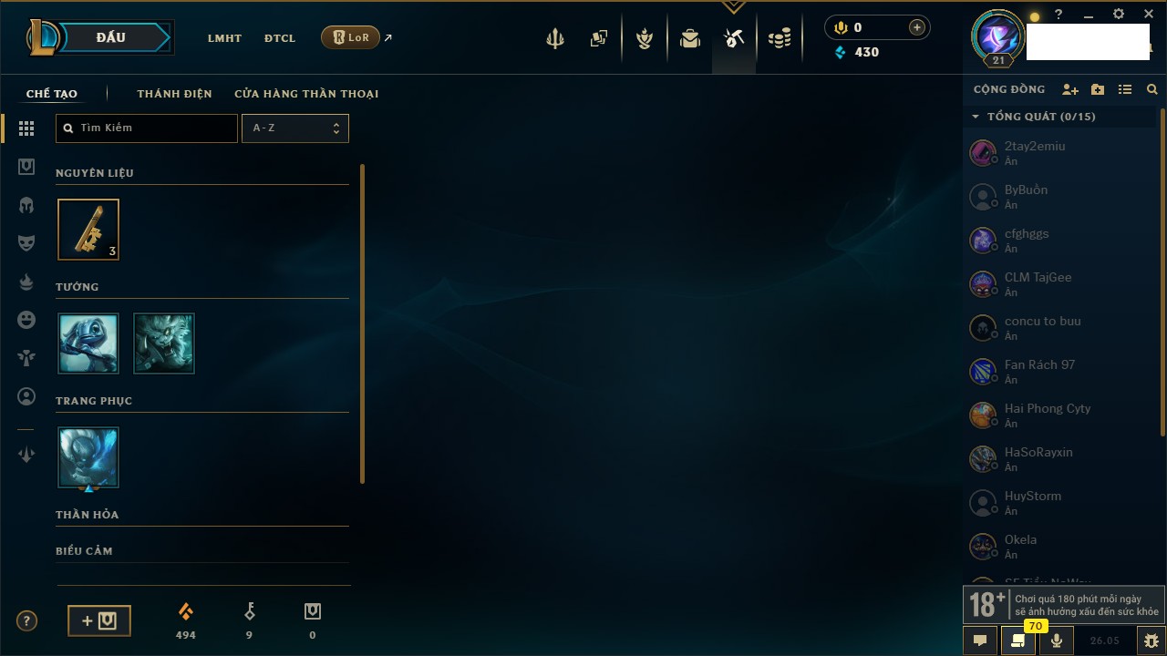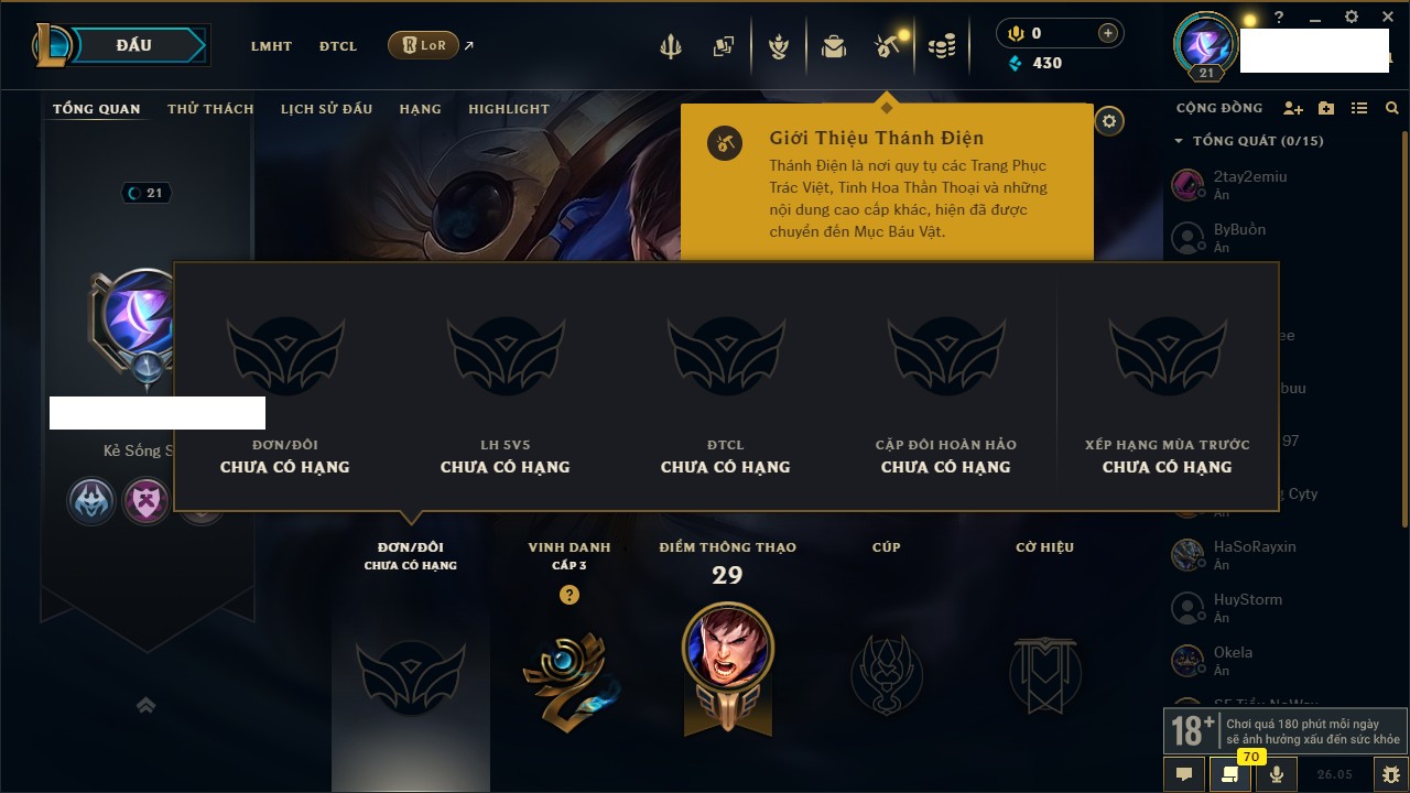 Rank Đơn: Chưa rank mùa nàoKhung: Chưa có khungTướng: 67 - Còn 2499 THXTrang Phục: 0Rank ĐTCL: Chưa RankLinh Thú: 12
