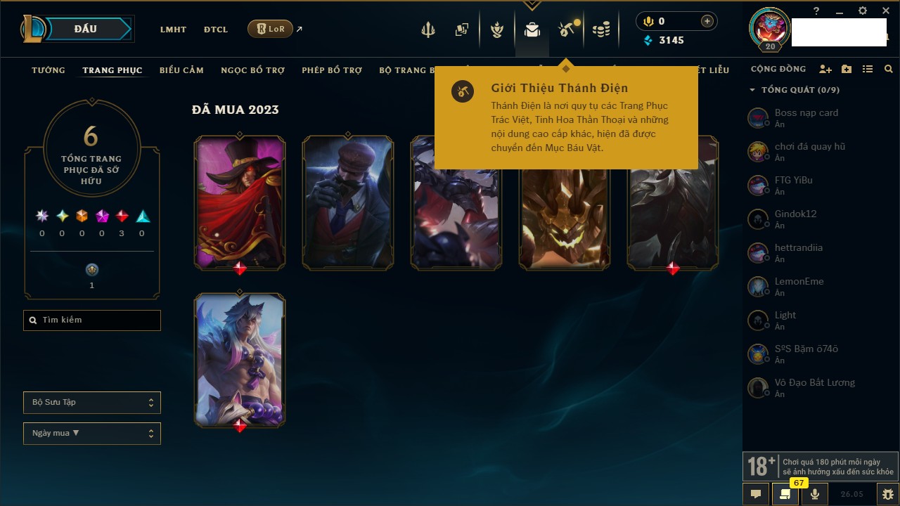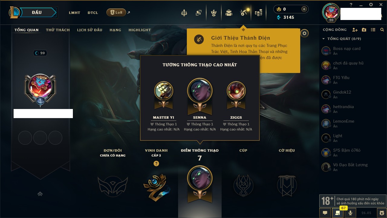 Rank Đơn: Chưa rank mùa nàoKhung: Chưa có khungTướng: 154 - Còn 1660 THXTrang Phục: 6Rank ĐTCL: Chưa RankLinh Thú: 18