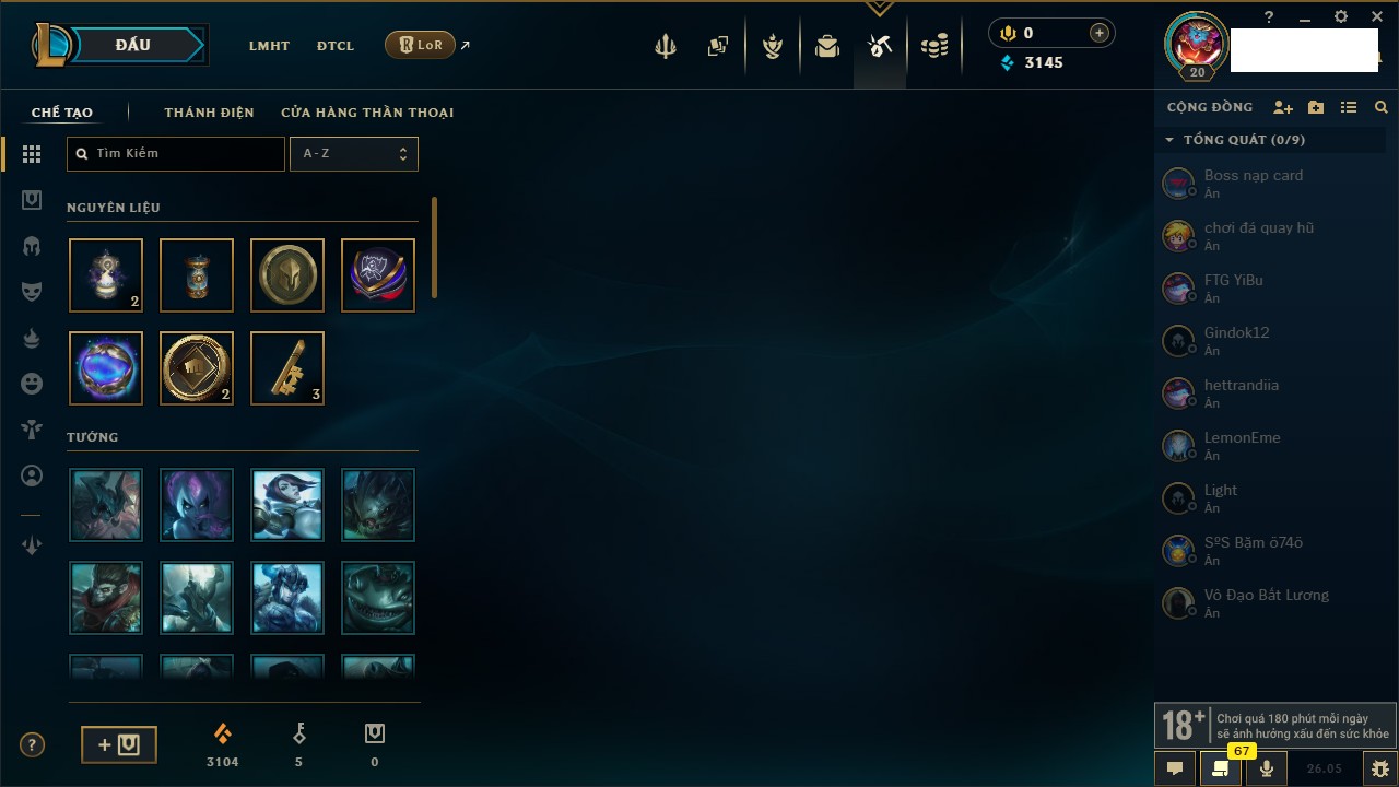 Rank Đơn: Chưa rank mùa nàoKhung: Chưa có khungTướng: 157 - Còn 11755 THXTrang Phục: 6Rank ĐTCL: Chưa RankLinh Thú: 24
