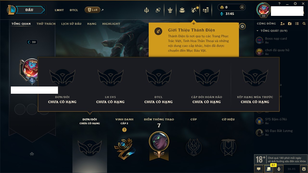 Rank Đơn: Chưa rank mùa nàoKhung: Chưa có khungTướng: 7 - Còn 33750 THXTrang Phục: 0Rank ĐTCL: Bạch Kim ILinh Thú: 25
