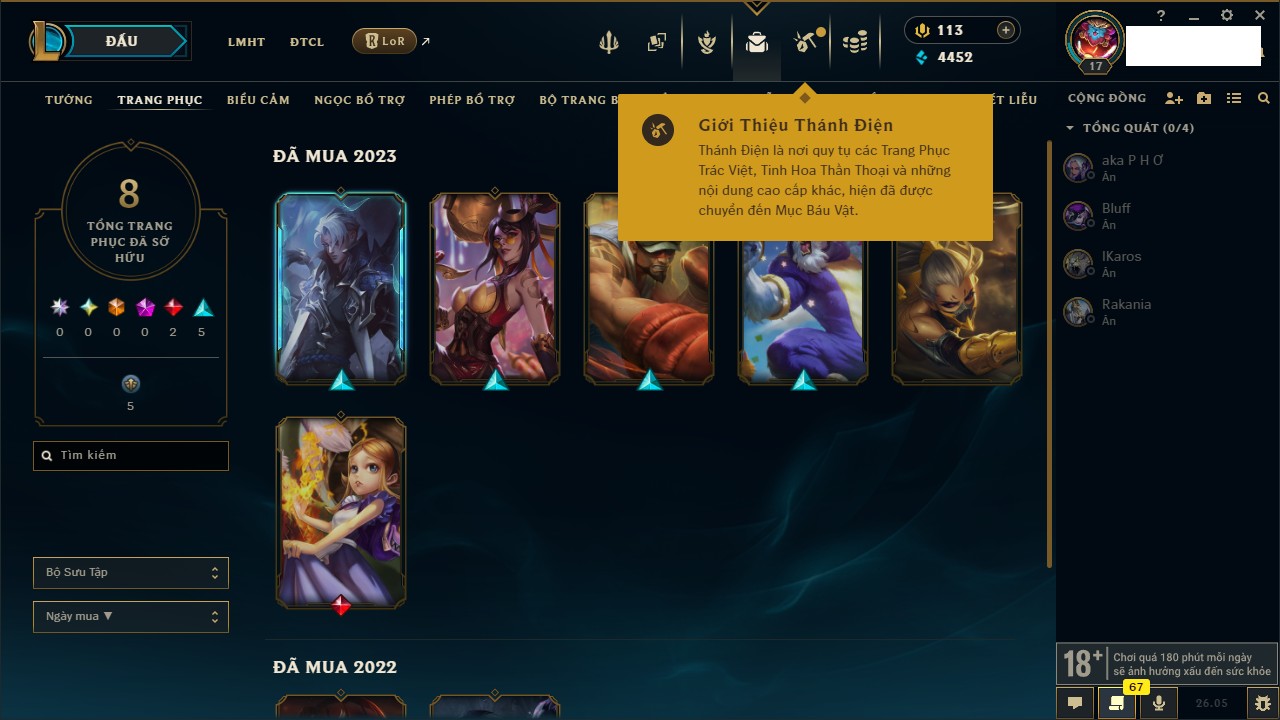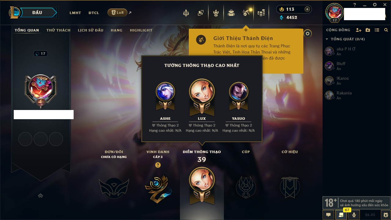 Rank Đơn: Chưa rank mùa nàoKhung: Chưa có khungTướng: 147 - Còn 4452 THXTrang Phục: 8Rank ĐTCL: Chưa RankLinh Thú: 13
