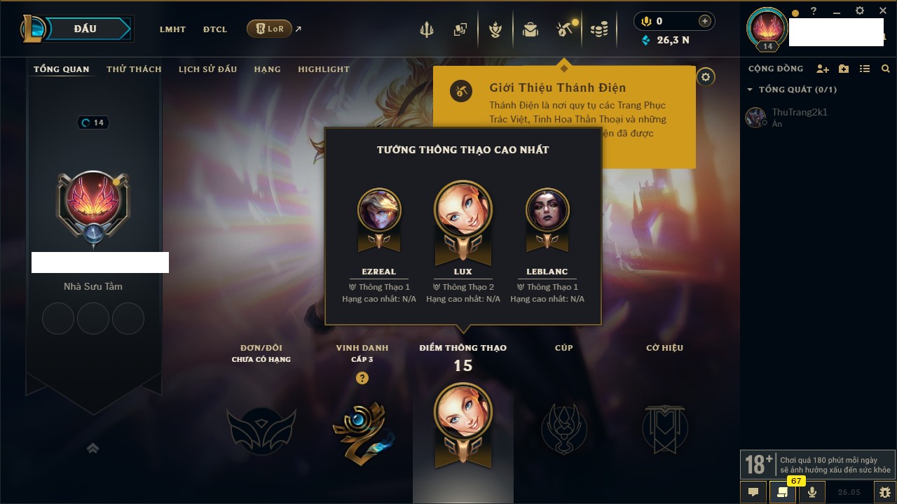 Rank Đơn: Chưa rank mùa nàoKhung: Chưa có khungTướng: 5 - Còn 6300 THXTrang Phục: 0Rank ĐTCL: Bạc IIILinh Thú: 17
